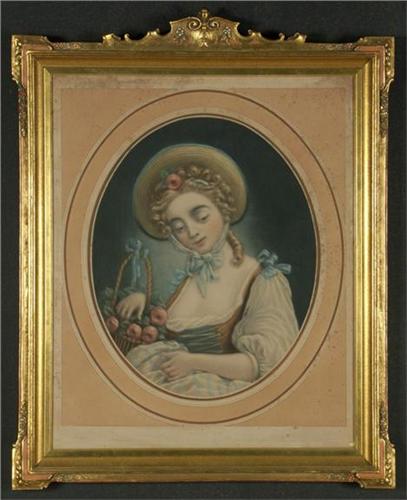 HANDCOLORED LITHOGRAPH 16 1/4'' X 13'' Oval, Unsigned. Portrait of a maiden holding a basket of roses. Late 19th, early 20th century. Matted and placed in an ornate gilt frame with pediment and handpainting. Foxing occurs on matting but does not appear to affect image.