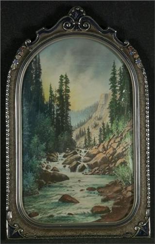 HANDCOLORED LITHOGRAPH 15 3/8'' X 9 3/8'' (Oval top), Unsigned. A mountain river. Placed in a vintage handcolored silvertone paste frame with pediment. Original retail stamping on the verso.