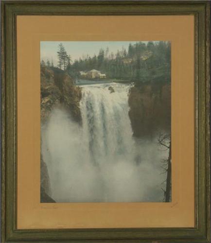 HANDCOLORED PHOTOGRAPH 17'' x 13 3/4'', Signed Jan Oliceda(?) on the mat lower right. Titled ''Snoqualmie Falls'' on the mat lower left. Placed in a gilt and green-tinted frame on top of the mat.
