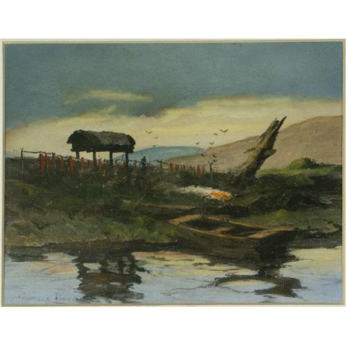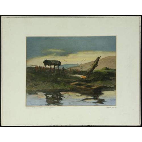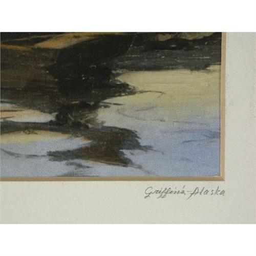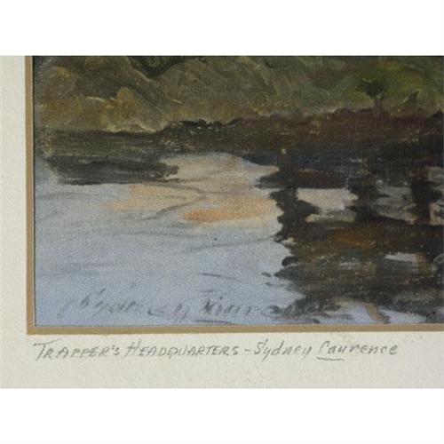 HANDCOLORED PHOTOGRAPH 8'' x 10'', Sydney Mortimer Laurence (1865-1940), AK. ''Trapper's Headquarters, Griffin's, Alaska''. Signed lower left. Titled and signed lower left, on the matboard. Image location lower right, on the matboard. Photograph adhered to backing. Matted; mat condition as seen. Unframed. Known as Alaska's foremost painter, Laurence studied and painted professionally in New York and England before traveling to Alaska where he partook in the country's gold rush. He spent the remainder of his years painting images of the Alaskan countryside and its native people. More info. in the white binder.