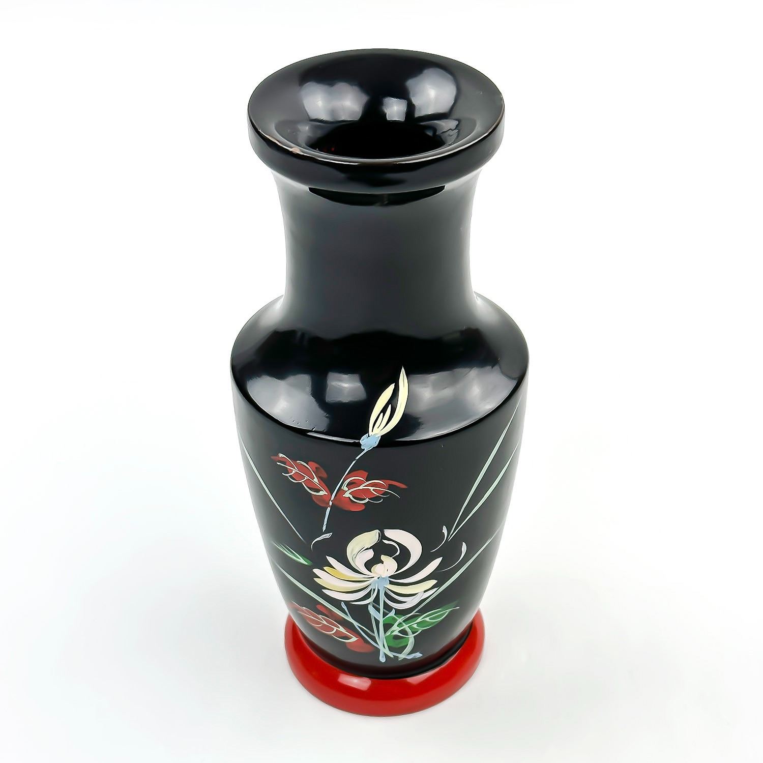 #8921 - HAND PAINTED LAQUER WARE STYLE WOOD VASE. MEASURES: 7” (18 CM) TALL BY 3.125” (8 CM) WIDEST DIAMETER