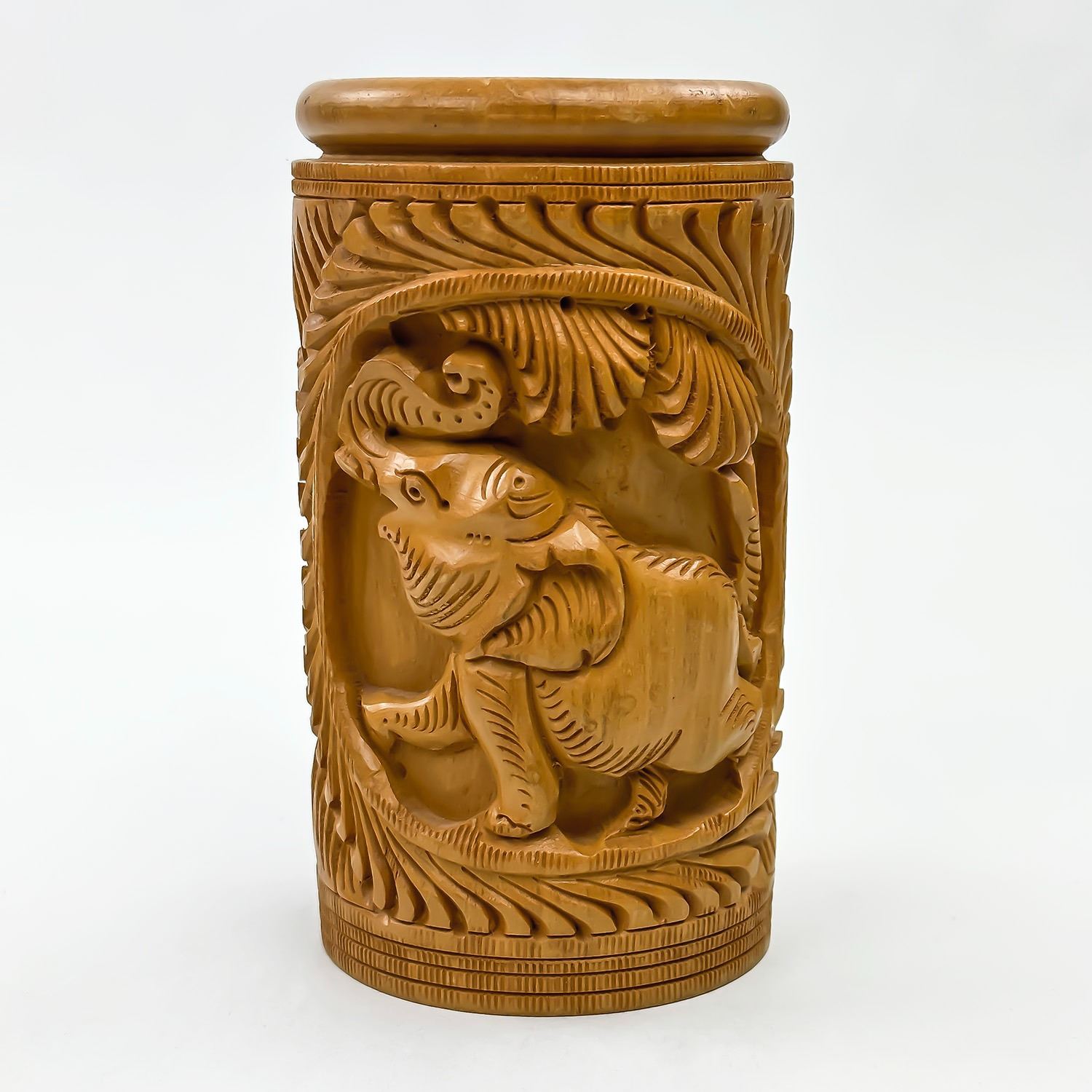 #8649 - ELEPHANT THEMED PENCIL HOLDER WOOD CARVING. MEASURES: 5” (13 CM) TALL BY 2.75” (7 CM) DIAMETER***ITEM(S) LOCATED IN LETHBRIDGE ALBERTA. FREE TRANSPORT TO EDMONTON OFFICE AVAILABLE FOR THIS AUCTION. WORLDWIDE SHIPPING IS AVAILABLE FOR ALL ITEMS