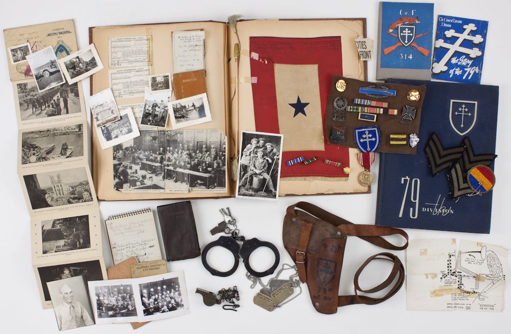 A plethora of material is included in this excellent grouping: gunmetal black Peerless handcuffs and keys used by Manly to transport prisoners, mainly Rudolph Hess; exceedingly rare white helmet liner with green webbing and brown leather sweatband bearing the emblem of the 6850th Internal Security Detachment on both sides of the helmet and hand-marked with Manly's name within (two minor 1" tears to edges with no loss); Army-issue "Ike" jacket with 1st Infantry Division and Army Services Forces shoulder patches, also sergeant and service stripes, with pants (the 6850th served as part of the 1st Infantry); Army standard issue visor cap; 1943 U.S. Army whistle and steel chain, two sets of Manly's dog tags; Army-issue pocket New Testament; two LIFE magazine photos and two original 4" x 3" b/w photos showing Manly in guard's uniform and standing at the dock with the principal war crimes defendants in forefront; leather pistol shoulder holster marked with Manly's initials, regiment, and a Cross of Lorraine; multiple medals and insignia including C.I.B., qualification badges, 79th Infantry shoulder patch and chest pin, ribbon bars, sergeant's stripes, Presidential Unit Citation pin with oak leaf; and much ephemera including three notebooks with addresses of friends and other notes, a scrapbook kept by a family member tracking Manly's war record, along with a window flag hung in his memory; his signed pay book; nine photos of friends, captioned on verso, Manly's stenciled duffel bag; three war-date printed company and regimental histories, bound, and a November, 1945 extensive bound regimental history. Overall fine condition. Obviously, this grouping includes the rarest helmet obtainable, and as a set, nothing comparable has ever been offered. Museum quality relics.