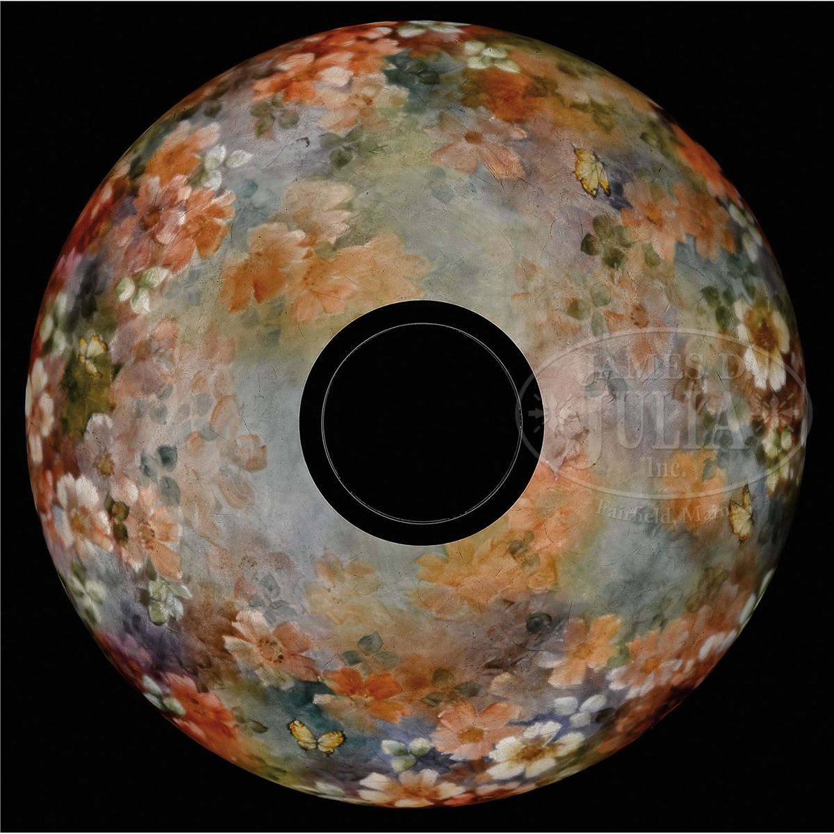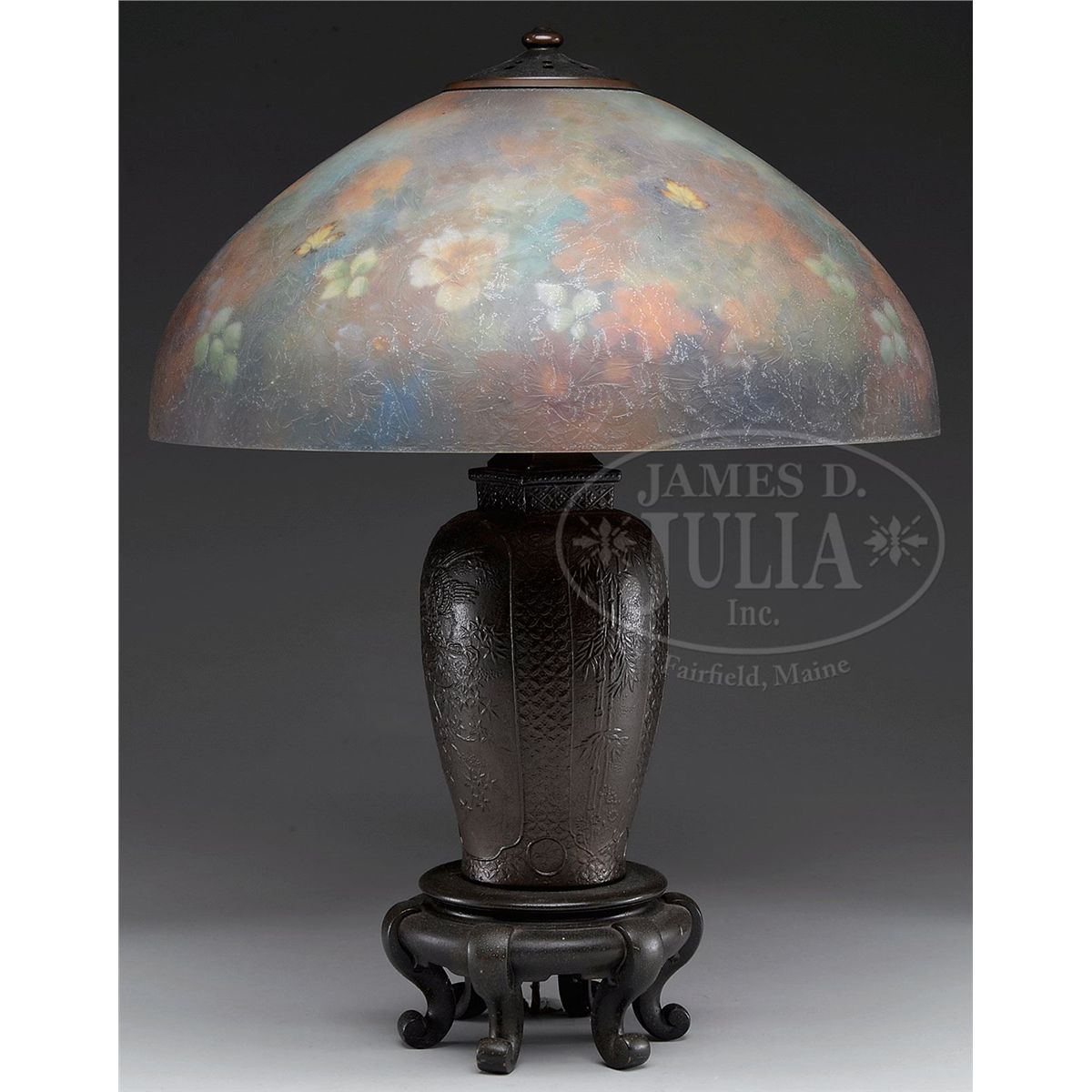 Handel 6688 table lamp has reverse painted shade with pastel flowers encircling the entire shade and reaching all the way to the top. The flowers are in pastel pinks, greens, reds and orange against a blue shading to light green background. The shade has four brightly colored butterflies flying amongst the flowers. The shade rests on an Oriental style urn base with front panel having exotic bird amongst vegetation, side panel with bamboo trees, and back panel with a spray of Oriental flowers. The base rests on six scrolled feet and has a three-socket cluster. Shade is signed "Handel Lamps" on metal aperture ring and has remnants of a signature. Base is unsigned. SIZE: Shade is 18" dia. Lamp is 23-1/2" t. CONDITION: Very good to excellent with some minor blistering to finish on base. 5-67044