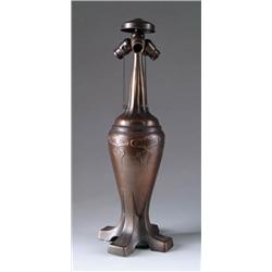 Lot 855 HANDEL ART NOUVEAU LAMP BASE Very nice bronze tone lamp base has four square feet curving upward to an urn shaped base with Art Nouveau ribbon type design at the waist.  Ribbed riser supports three-socket cluster.  Sockets have acorn pulls.  Base has original Handel cap, but no finial.  SIZE:  25” t.  CONDITION:  Very good to excellent.  5-71529