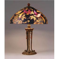 Lot 596 HANDEL BIRD OF PARADISE TABLE LAMP Rare Handel table lamp has beautiful brightly colored tropical birds against a rich black background. The birds are surrounded by tropical flowers and foliage. Chipped ice exterior of shade gives the reverse painting a wonderful depth. Shade is signed “Handel 7026” and artist signed “Broggi”. Shade sets atop a heavily enameled gold base with red enameled berries separating the stylized leaf design around the foot. Lamp has original amber glass prisms and matching amber glass finial. Base is signed with label on felt. SIZE: Shade is 18” dia. Overall height is 24” t. CONDITION: Some very minor paint loss to heat cap, otherwise very good to excellent. 5-70642