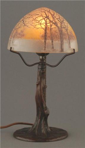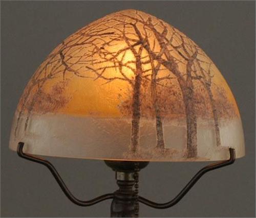 "HANDEL BOUDOIR LAMP with tree trunk base and closed top acid etched Winter scene shade, 7"" diameter, excellent 12 3/4"" high packing and shipping (excluding insurance) $50"