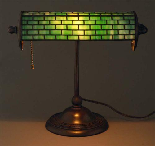 "HANDEL DESK LAMP with geometric overlay glass green shade, with 3 curved glass panels overlaid to resemble leaded glass, 12 1/2"" high shade 10"" wide, condition: excellent, signed on base only "