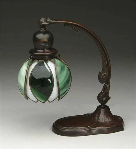 HANDEL DESK LAMP. Leaded tulip form shade with green striated and white textured petals. The base with curved arm and double knuckles for adjustment. Base is signed "HANDEL" on affixed to felt pad on underside. SIZE: Overall height is 11-1/2". CONDITION: One green petal is cracked. Arm of base loose at solder joint. Lower adjustment knob missing nut. Brown patina is very good. 5-62355