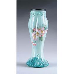 Lot 624 HANDEL FLORAL VASE Porcelain vase with dogwood decoration, pink on aqua with original metal top band. Signed “Handel 222-804”. SIZE: 12” t. CONDITION: Very good to excellent. 5-70796