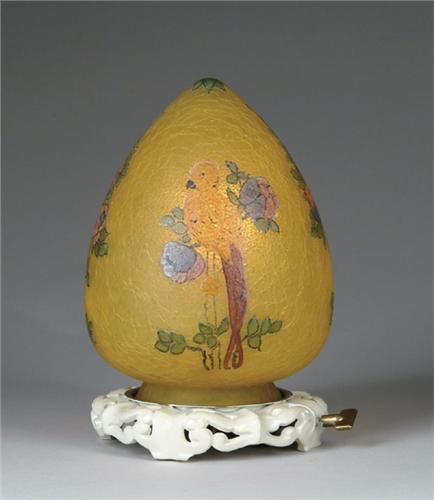 HANDEL NITE LITE. Beautiful Handel nite lite has egg shaped shade, obverse painted with parrots and flowers against a yellow crackled background. Shade is signed on edge of fitter "Handel 1095" with artist initials "AH". Shade rests on an Oriental style open metal work base. SIZE: 8 in. t. CONDITION: Base has been painted white, otherwise very good to excellent. 5-61186