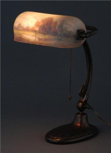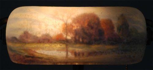HANDEL REVERSE PAINTED DESK LAMP with 8" scenic painted shade, unsigned but marked with model #6765A?, base retains felt label, condition: excellent with some patina loss to base,