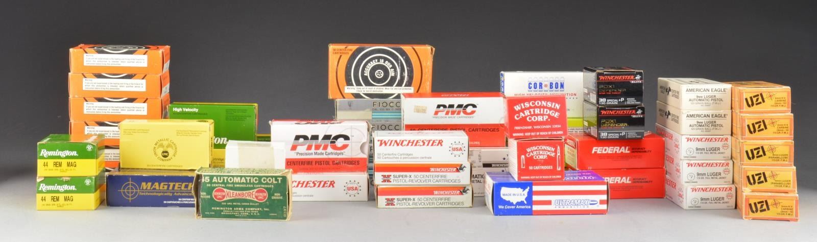 Lot contains hollow point ammunition. 1 Sealed box of 50 rds. 32 S&W United States Cartridge Co. Green & tan box has revolver picture. / 1 Box of 16 rds. German 9MM Luger 1943 “d n h”. 9MM LUGER: 4 Boxes of 50 rds. Winchester 115 grain full metal jacket. / 3 Boxes of 50 rds. American Eagle 123 grain full metal jacket. / 9 Boxes of 50 rds. R&R Enterprises 147 grain jacketed hollow point. / 6 Boxes of 50 rds. Uzi carbine/SMG & 115 grain full metal jacket. / 2 Boxes of 50 rds. headstamped “MM 6 43” ball. / 1 Box of 50 rds. Cor-Bon +P 115 grain jacketed hollow point. / 1 Partial box of 35 rds. Federal 147 grain jacketed hollow point. / 2 Boxes of 50 Winchester “Subsonic” 147 grain silver tip. / 1 Box of 50 Winchester 115 grain silver tip. / 1 Partial box of 40 rds. Winchester “Win Clean” 115 grain BEB. / 1 Box of 50 rds. Four Corners Bullet Co. 147 grain jacketed hollow point. 38 SPECIAL: 3 Boxes of 50 rds. Wisconsin Cartridge Co. 158 grain semi wadcutter. / 1 Box of 50 rds. Norma 158 grain full jacket. / 1 Box of 50 rds. Ultra Mags 158 grain semi wad cutter. / 1 Box of 50 rds. 3-D 148 grain wad cutter. / 2 Boxes of 20 rds. Winchester PD X1 Defender +P 130 grain hollow point. 45 ACP: 1 Box of 20 rds. Winchester 185 grain silver tip. / 1 Box of 50 rds. Winchester 230 grain full metal jacket. 380 ACP: 3 Boxes of 50 rds. UMC 95 grain metal case. / 1 Box of 50 rds. Western 95 grain lubaloy. 455 WEBLEY: 4 Boxes of 50 rds. Fiocchi 262 grain lead. 455 COLT: 1 Box of 50 rds. Dominion 265 grain lead. 30 LUGER: 1 Box of 50 rds. Western lubaloy bullet. / 1 Box of 50 rds. Fiocchi 93 grain soft point. 38 S&W: 1 Partial box of 43 rds. Remington 146 grain lead. 32 S&W: 1 Box of 50 rds. 85 grain lead. 32 ACP: 1 Box of 50 rds. Western 71 grain lubaloy. / 1 Box of 50 rds. Remington 71 grain MC bullet. 25 ACP: 1 Box of 50 rds. Peters 50 grain MC. / 1 Box of 50 rds. Remington 50 grain MC. 357 MAG: 2 Boxes of 50 rds. Federal 125 grain jacketed hollow point. / 1 Partial box of 25 rds. USA 110 grain jacketed hollow point. / 1 Box of 50 rds. S&W 158 grain jacketed soft point. / 1 Box of 50 rds. S&W 125 grain jacketed soft point. 41 MAG: 1 Box of 50 rds. R&R Enterprises 215 grain semi wadcutter. / 1 Box of 50 rds. Remington 210 grain wadcutter. 44 REM MAG: 2 Boxes of 25 rds. Remington 240 grain hollow point. / 1 Box of 50 rds. American Eagle 240 grain jacketed hollow point. / 1 Box of 50 Blazer 240 grain jacketed hollow point. / 1 Box of 50 Mag Tech 240 grain short jacket hollow point. / 1 Box of 50 PMC 180 grain jacketed hollow point. / 1 Box of 50 rds. PMC 240 grain truncated cone hollow point. 22 JET: 4 Boxes of 50 rds. Peters 40 grain soft point. / 3 Boxes of 50 rds. Remington 40 grain soft point. / 1 Partial box containing 35 rds. of Remington 40 grain soft point. / 2 Boxes of 50 rds. Remington new, unprimed brass. / 2 Boxes of 500 rds. Hornady 40 grain jet hand loaders bullets. 8MM NAMBU: 1 Box of 50 rds. Midway 104 grain lead rnd. nose. / 1 Box of 50 rds. Midway unprimed, unfired brass. / 3 Boxes of 100 rds. lead rnd. nose hand loaders bullets. / 24 loose rds. in plastic bag of loaded ammunition. Cases are marked “FC 8MM NAMBU”. / 1 Set of CH Reloading Dies w/ instructions & 1 CH Nambu shellholder. CONDITION: condition ranges from fair to very good, boxes may have wear, scuffing, tears or missing end flaps. (02-14124-5/RW). $500-900.