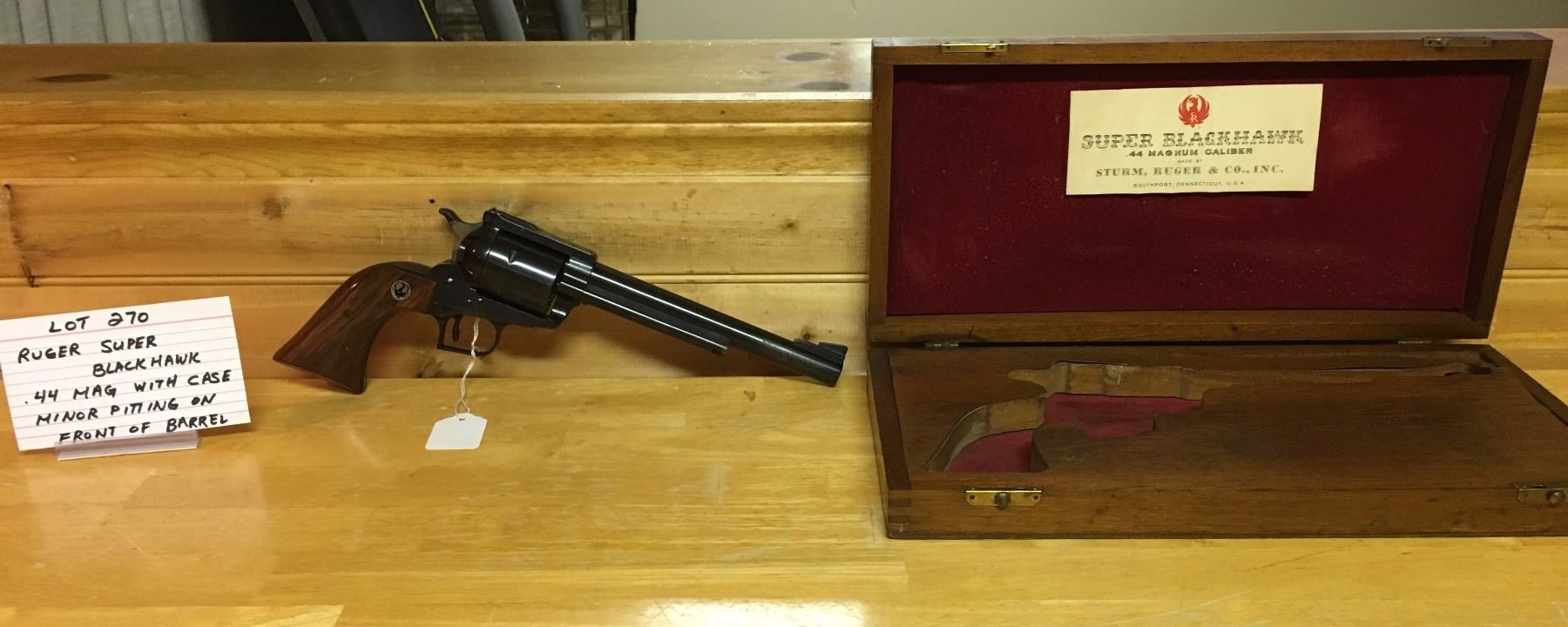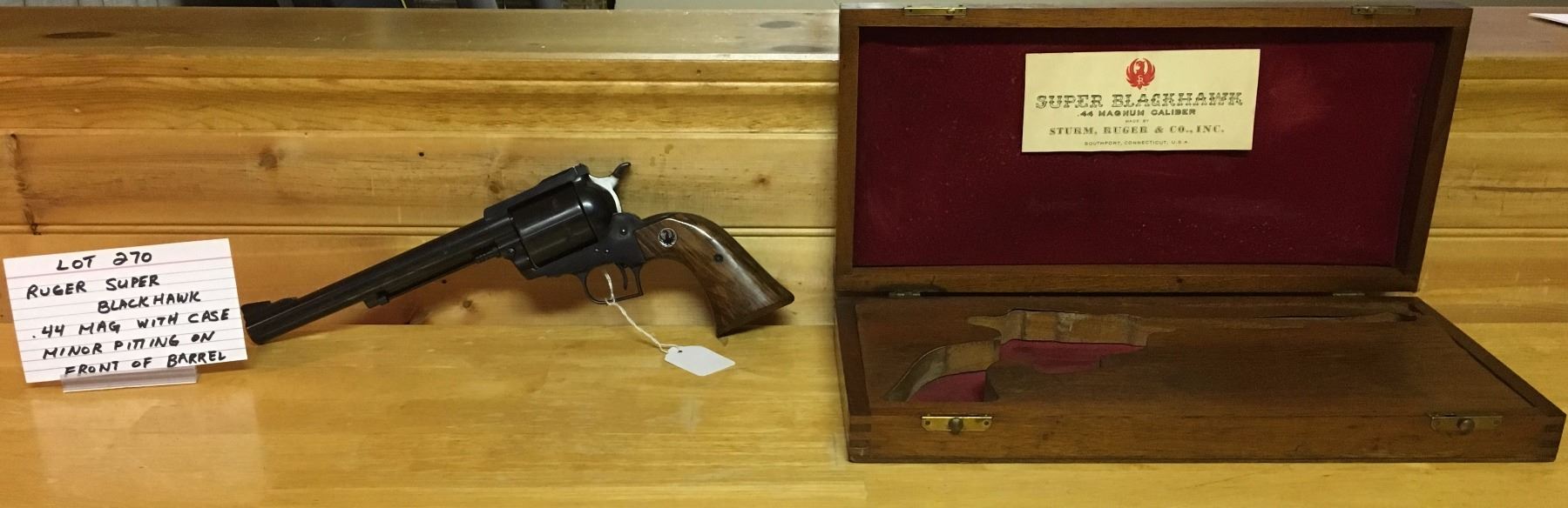 RUGER, MODEL SUPER BLACK HAWK, .44 MAG, S/N 1134, 6 SHOT, CONDITION/ SOME PITTING ON BARREL, W/ MAHOGANY PRESENTATION CASE