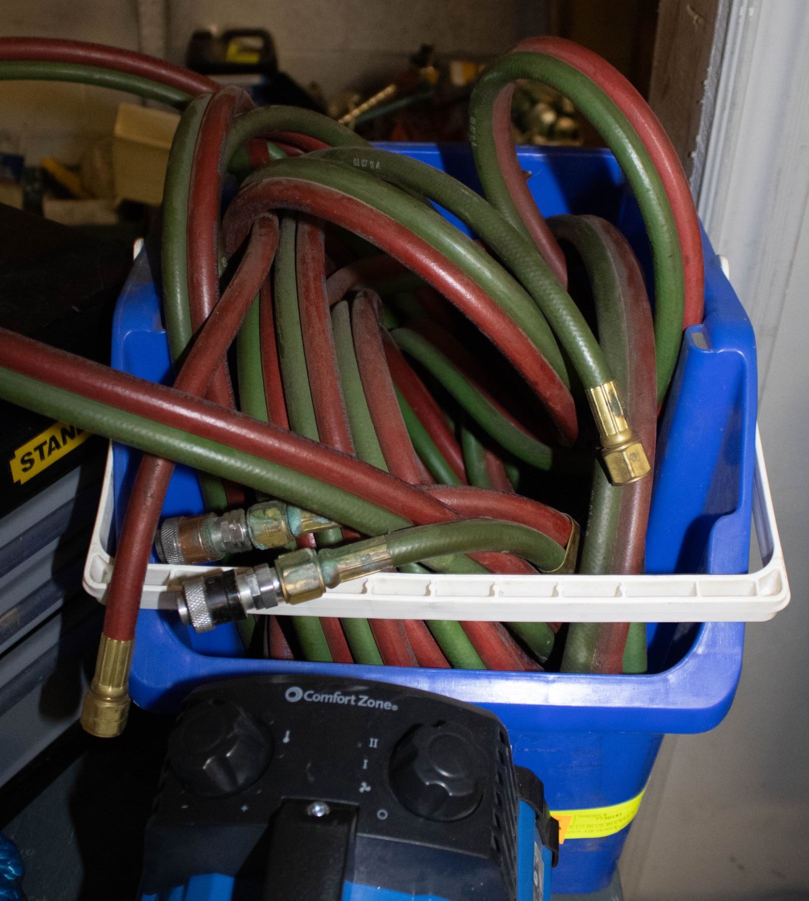 HANDLED BLUE BUCKET WITH VARIOUS AIR HOSES