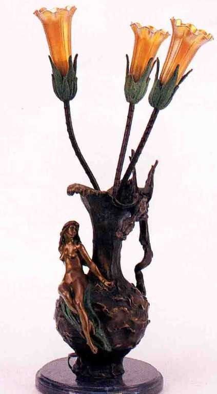 "HANDLED VASE WITH NUDE" BRONZE SCULPTURE LAMP - AFTER DEBUT - BEAUTIFUL COLOR PATINA - MOUNTED ON A FINE ITALIAN MARBLE BASE - BEAUTIFULLY DETAILED - SIGNED - MINT CONDITION - 26"H X 10"W - LOST WAX CAST BRONZE