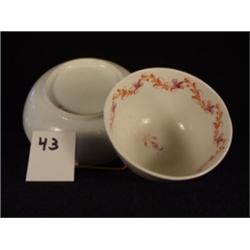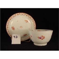 Handleless cup & saucer, 1820-1840, hand painted florals in mulberry & iron red, not exactly matching, but a happy marriage. Cup is 2" tall and 3 3/8" wide and in good condition, decorated inside and out. Saucer is 5 1/8" w/minor wear to paint on rim.