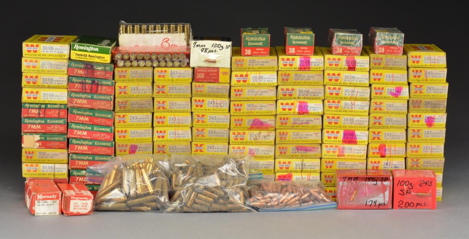 LOT CONTAINS HOLLOW POINTS. NEW & FIRED BRASS. 50 - 20 Rd. boxes of 243 Win. fired & primed brass mostly Win. yellow & white boxes. / 28 - 20 Rd. boxes of 30-06 fired & primed brass mostly in Win. yellow & white boxes. / 10 - 20 Rd. boxes of 300 Win. Mag. fired & primed brass mostly in Win. yellow & white boxes. / 17 - 20 Rd. boxes of 7mm Rem. Mag. mostly in Rem. red & green boxes. / 1 - 47 Rds. bag of 45 Colt new empty primed brass. / 1 - 28 Rd. Partial box of 357 Max. of fired & primed brass. / 2 - 20 Rd. boxes 300 Savage fired brass. / 1 - 90 rd. bag of 45 ACP fired brass. / 1 - 20 Rd. box of 7mm-08 Rem. fired brass. / 1 - 50 Rd. bag of 220 swift new brass. / 1 - 30 rd. bag of 270 Win. pulled brass. / 2 - Bags totaling 100+ Rd. bag of 7mm Rem. Mag. pulled brass. / 1 - 30 Rd. bag of 22-250 Rem. fired brass. / 1 - 40 Rd. bag of 38 Spl. fired brass. / 1 - 20 Rd. box of 222 Rem. fired brass. / HANDLOADER'S BULLETS. 1 - 150+ Bullet bag of 30 cal. 180 gr. SP. / 2 - Boxes totaling 250+ bullets of 7mm cal. SP : 1 - 150 gr. & 1 - 120 gr. / 1 - 200 Bullet box of 243 cal. 100 gr. SP. / 2 - 100 Bullet box of Hornady 38 cal.: 1 - 158 gr. HP XTP & 1 - 150 gr. hollow point. / 4- Boxes totaling 300 bullets of 38 cal. cast semi-wadcutter. CONDITION: components may have tarnishing & wear, but appear serviceable. Boxes may have scuffing, wear, staining & tears. (02-14675-5/RW). $200-400.