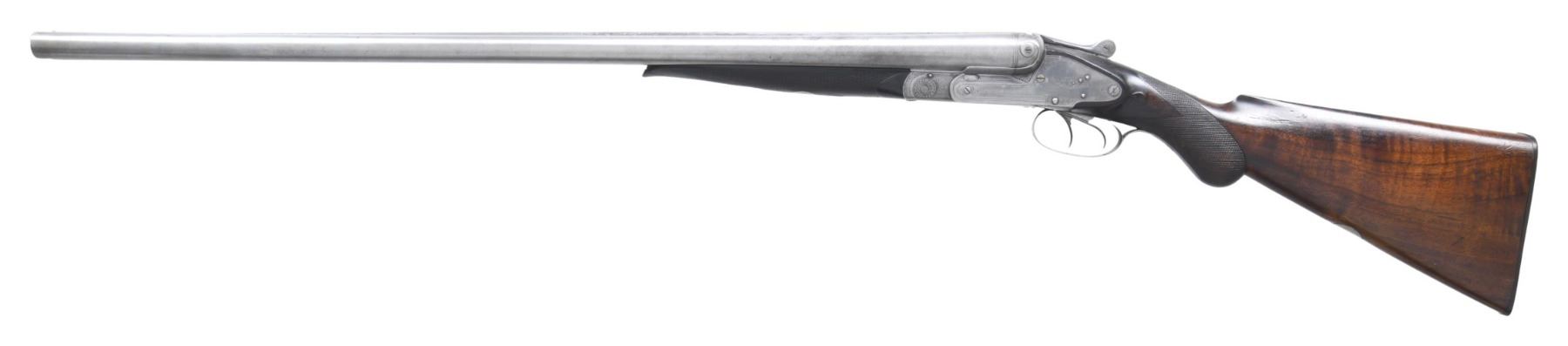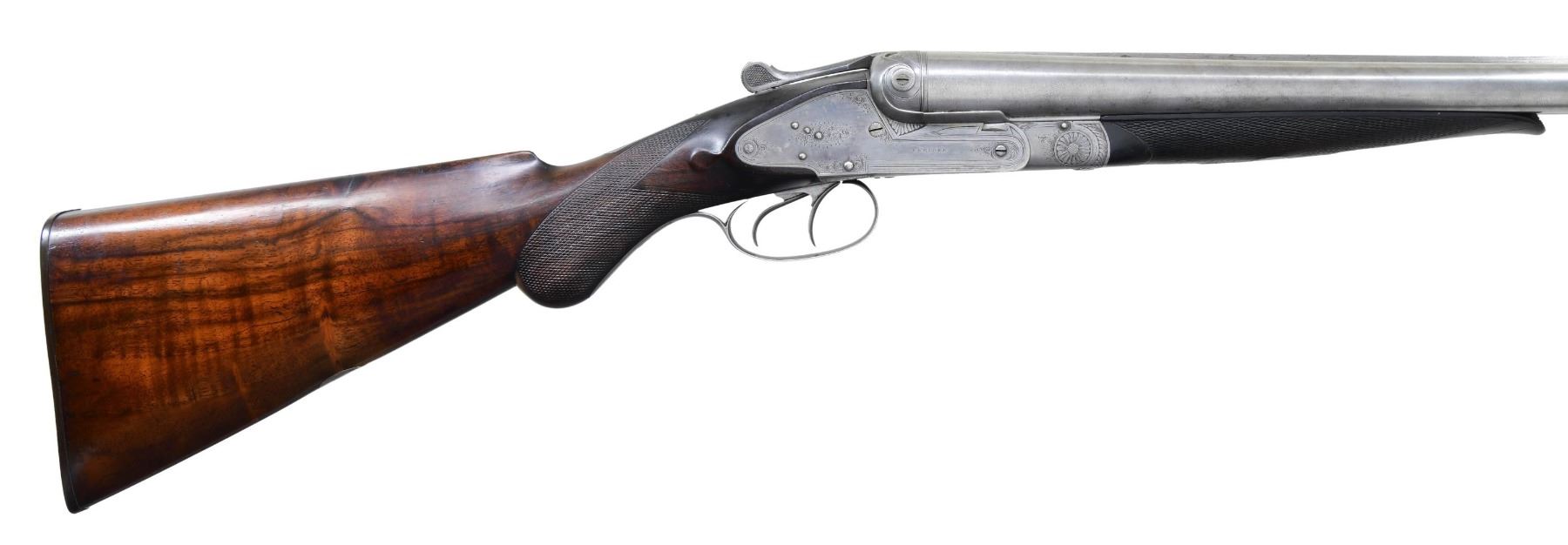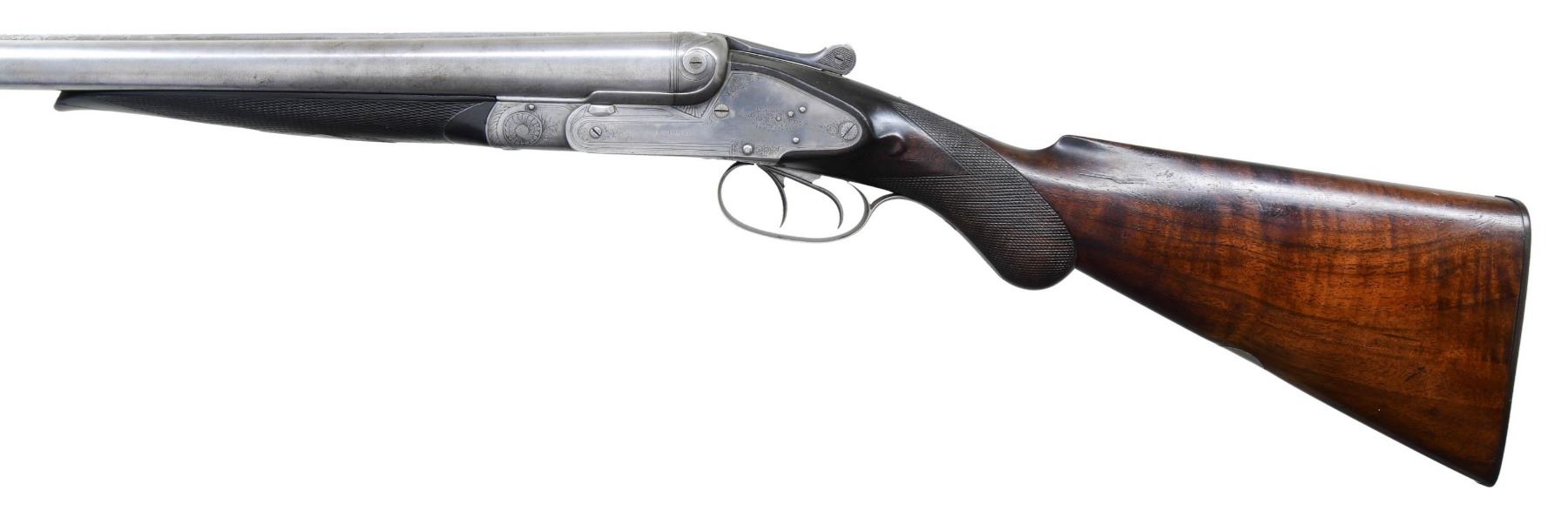 Cal. 10 Ga. 2-7/8". S# 572. Sneider was working in Baltimore after 1865. He was an innovative gunmaker and patented many improvements. His 1880 patent covered this type of hammerless gun. It has 30" two striped damascus barrels engraved "SNEIDERS PATENT BALTIMORE MD." on game rib with short extension. Case hardened action features Sneider's unusual safety with knurled button on thumb piece which depresses a rod unlocking triggers. When in fire position, action can not be opened. Other innovations include coil springs for locks, and a transverse sliding bolt which acts as barrel stop putting less stress on hinge pin. Gun locks up with square crossbolt through rib extension and single under lug. Action is engraved with sprays of well cut scroll within line borders "SNEIDER" is on each lockplate. Trigger guard with scroll on bow has S# on tang. Round knob pistol grip buttstock of fiddle figured American walnut measures 14-1/4" over checkered hard rubber buttplate. Stock features drop points, well cut grip checkering and a vacant silver oval on toeline. Matching splinter forend with small ebony tip has push button release. MEASUREMENTS: BBLS: Bore Diameter: L .783. R .783. Restriction: L .028 (mod). R .027 (mod). Wall thickness: L .032. R .025. STOCK: DAH: 3". DAC: 1-3/4". CAST: about 1/2" off. LOP: 14-1/4". WEIGHT: 9 lb. 13 oz. CONDITION: good. Barrels show light cleaning to smooth silver with some minor flecks. It appears barrel brown was never very dark. Action retains traces of original case hardening color with lockplates exhibiting half of this very light color. Stocks retain most of what appears to be their original oil finish with many marks. Bores are very fine, bright and shiny throughout. Action is tight. Mechanically good. A good example of a scarce American gun. (01-26976/MGM). ANTIQUE. $1,500-2,500.