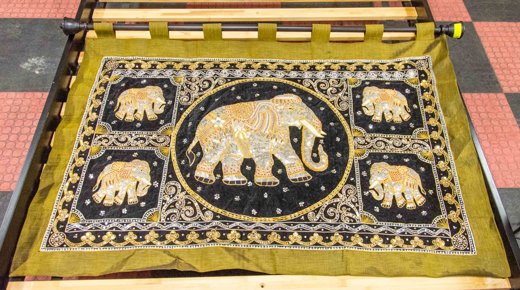 INTRICATELY BEADED ELEPHANTS WITH GOLD AND BLACK BORDERS - 54"L X 40"H) **ALL ITEMS MUST BE REMOVED BY 5PM SATURDAY, DECEMBER 3RD, 2022. ALL REMAINING ITEMS WILL BE SUBJECT TO A $6.00 PER DAY STORAGE CHARGE. ANY ITEMS REMAINING AFTER MONDAY, DECEMBER 18TH, 2022 WILL BE CONSIDERED FORFEITED. NO REFUNDS WILL BE ISSUED FOR FORFEITED ITEMS. TO SCHEDULE A PICK UP APPOINTMENT CLICK HERE