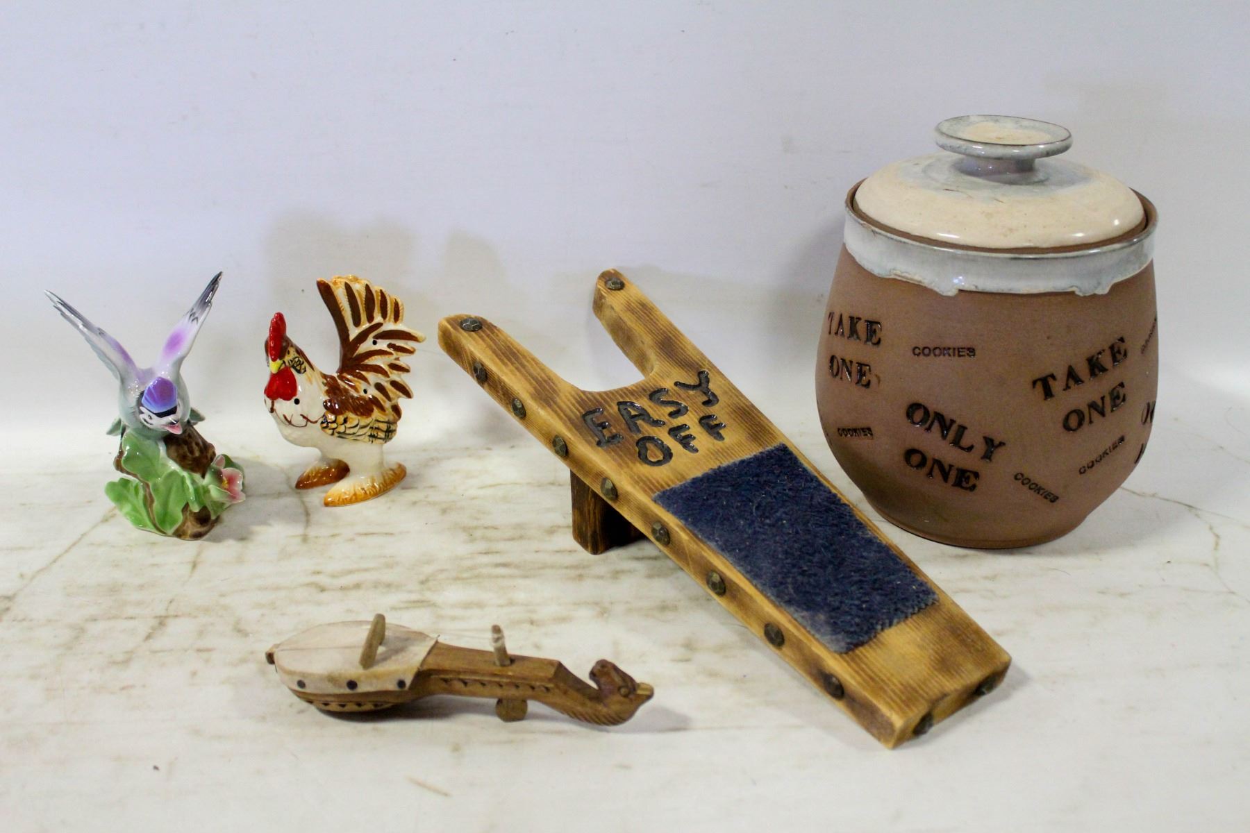 PORCELAIN GIFTCRAFT ROOSTER, HANDMADE MINI WOODEN LEATHER HORSE HEAD TOPED NOVELTY INSTRUMENT, DONNA BURTON COOKIE JAR WITH LID, PORCELAIN BLUE JAY 6 INCHES TALL**ALL ITEMS MUST BE REMOVED BY 5PM SATURDAY, JULY 19TH 2025. ALL REMAINING ITEMS WILL BE SUBJECT TO A $6.00 PER DAY STORAGE CHARGE. ANY ITEMS REMAINING AFTER MONDAY, AUGUST 4TH, 2025 WILL BE CONSIDERED FORFEITED. NO REFUNDS WILL BE ISSUED FOR FORFEITED ITEMS. TO SCHEDULE A PICK UP APPOINTMENT CLICK HERE