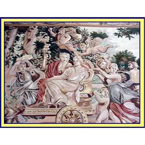 Impressive figural needlepoint in wools depicting a Classical allegorical scene with heroes and heroines, cherubs and putti. Full of movement and drama. Nice detail. Measures 6X9foot. Origins and date unknown. Excellent condition.