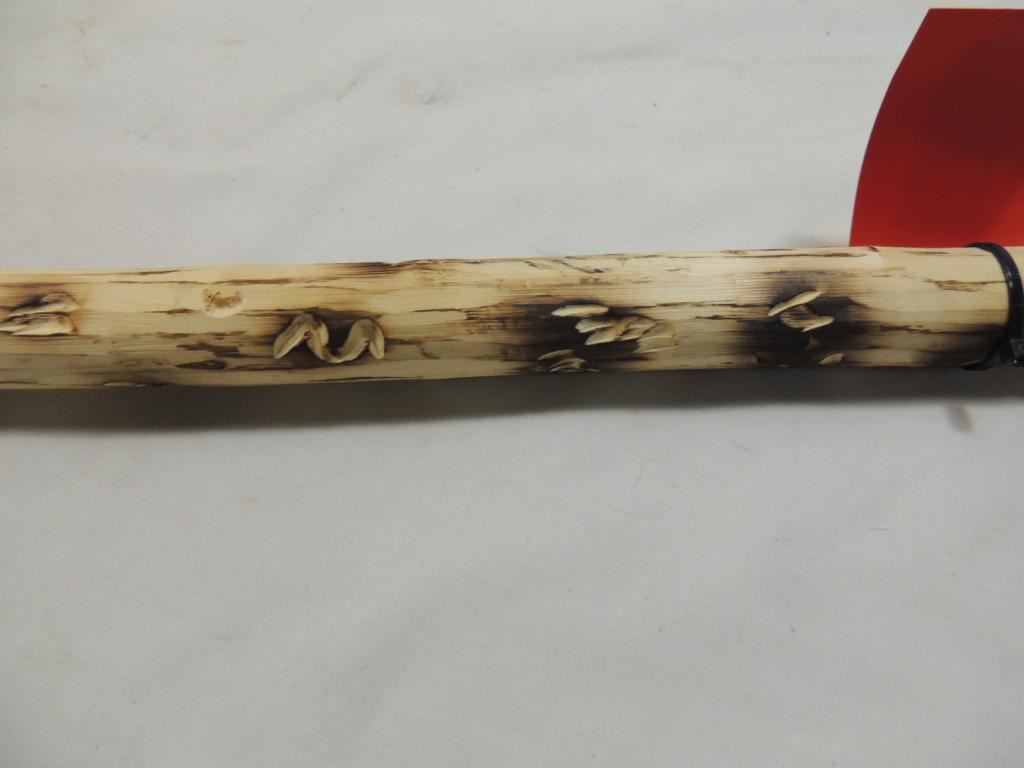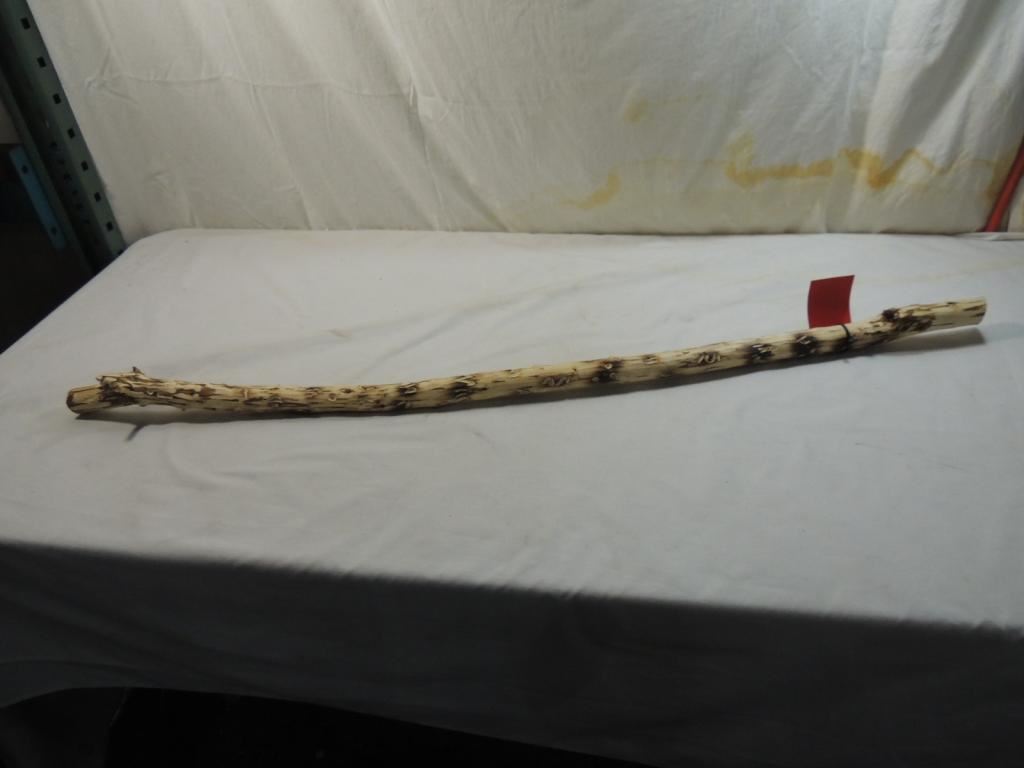 DECORATIVE CARVED, BURNT, STAINED, PAINTED, RUBBER STOPPER BOTTON, WOODEN NATRUAL WALKING STICK ARTISTIC WALKING STICK. AS SHOWN SEE PHOTO FOR MORE DETAILS.
