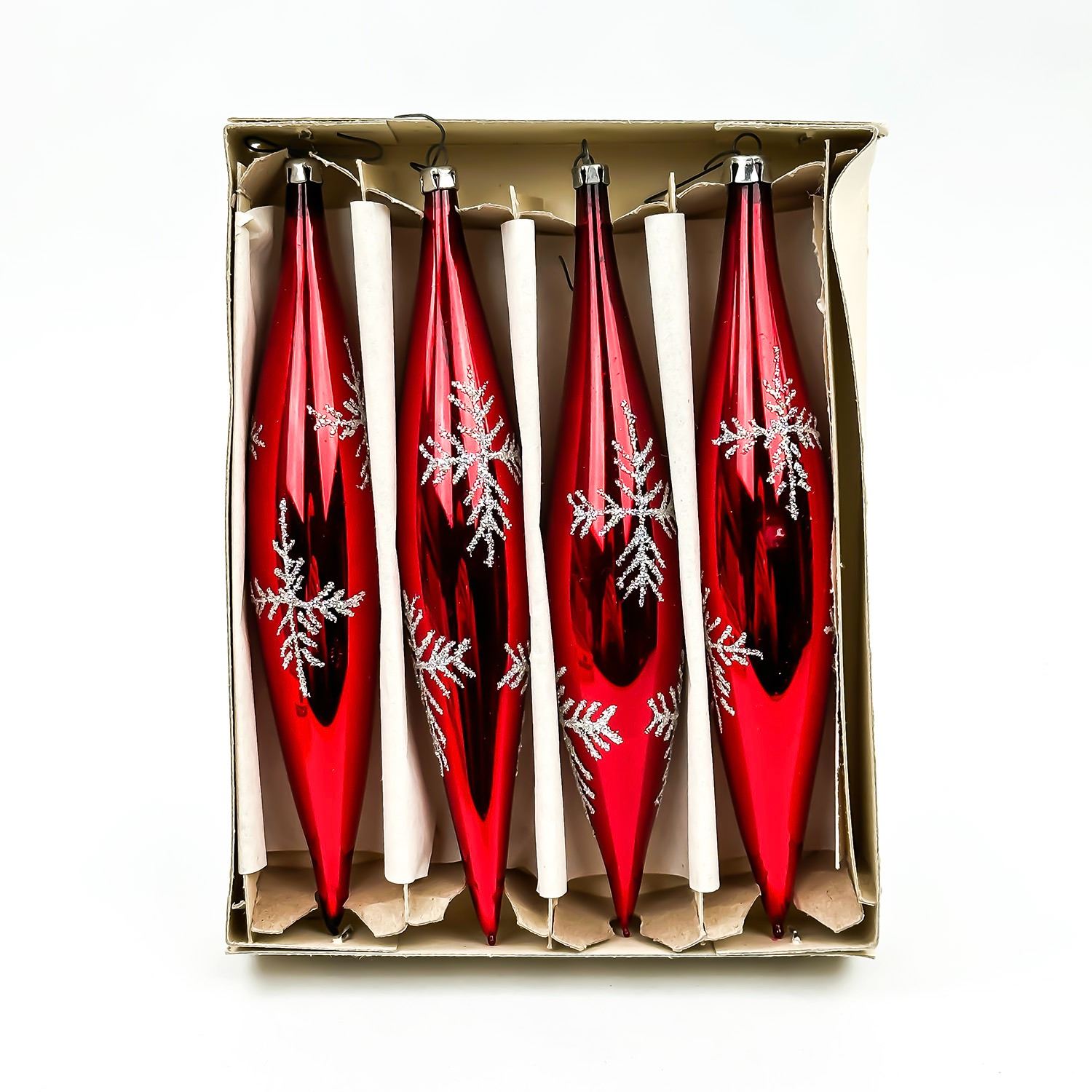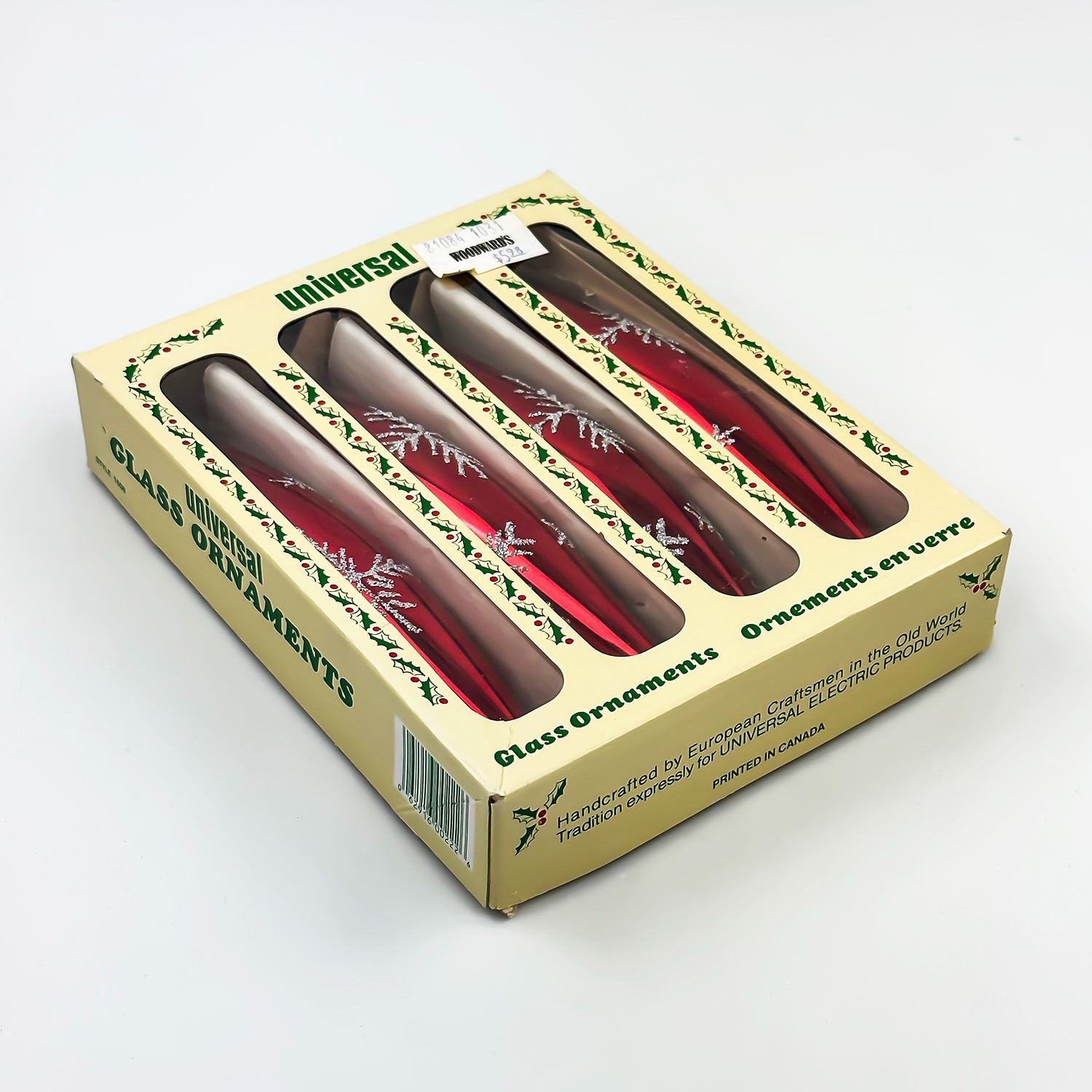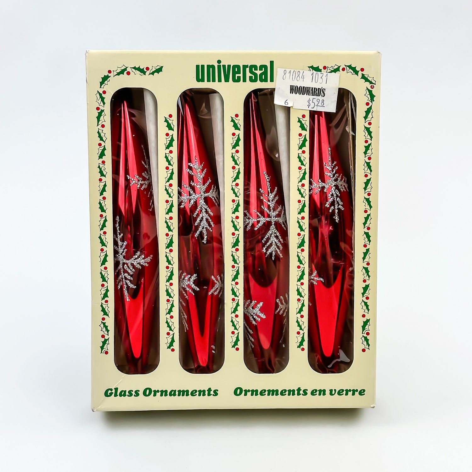 #8562 - CHRISTMAS TREE XMAS ORNAMENT BY UNIVERSAL GLASS ORNAMENTS - STYLE 1608 - TORPEDO OR TEARDROP STYLE. HAND CRAFTED BY EUROPEAN CRAFTSMAN IN THE OLD WORLD TRADITION FOR UNIVERSAL ELECTRIC PRODUCTS. SOLD BY WOODWARD’S DEPARTMENT STORE BACK IN THE***ITEM(S) LOCATED IN LETHBRIDGE ALBERTA. FREE TRANSPORT TO EDMONTON OFFICE AVAILABLE FOR THIS AUCTION. WORLDWIDE SHIPPING IS AVAILABLE FOR ALL ITEMS