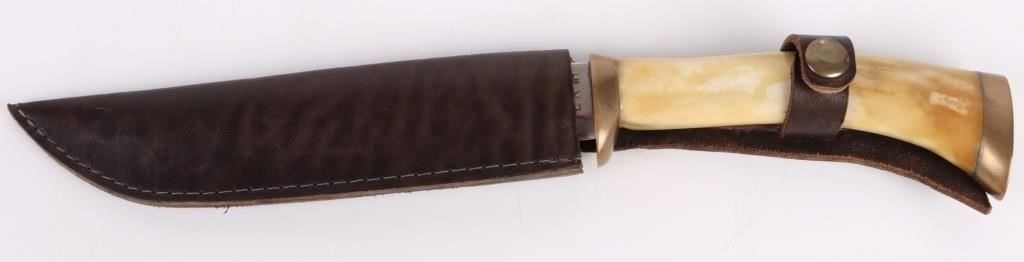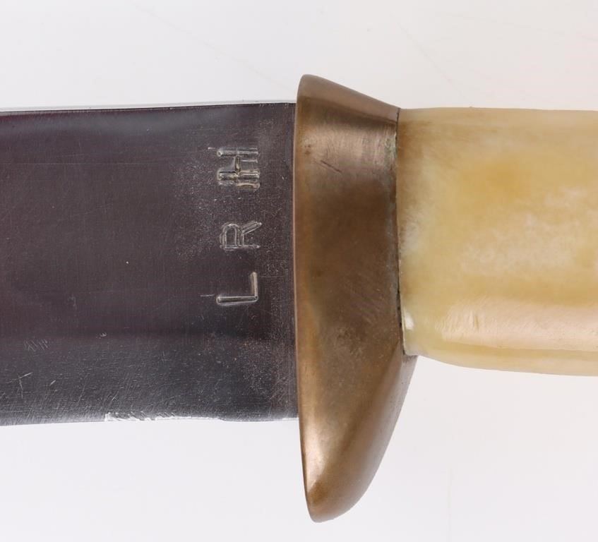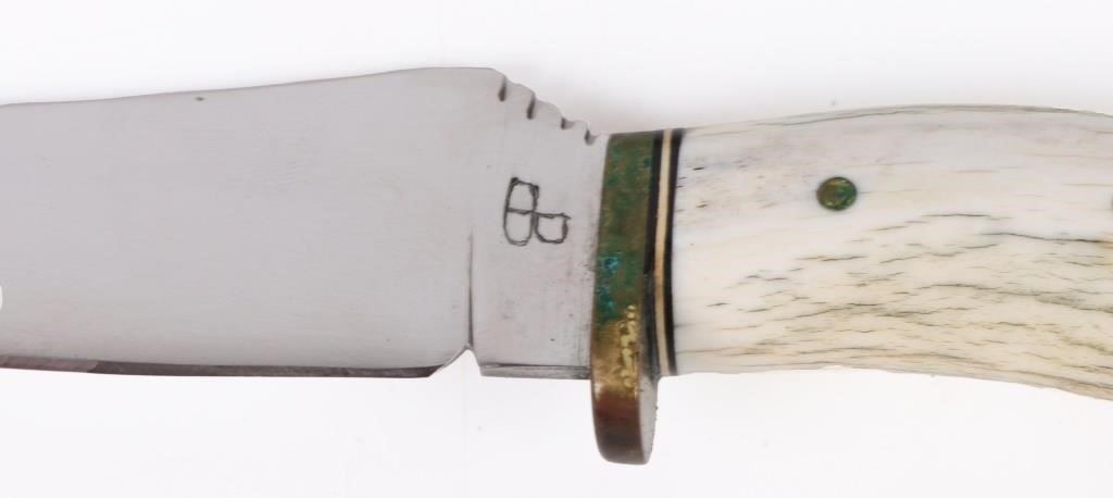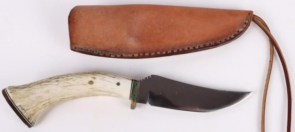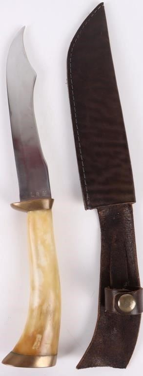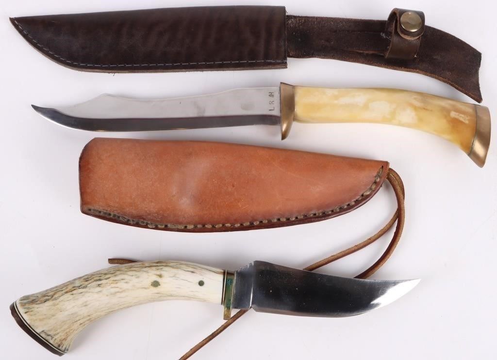Handmade steel knives w/ leather scabbard to include one 7" blade w/ two ridges along the spine, a bronze guard and pommel shaved into the shape of a cow hoof, a sanded and polished bone handle and the engraved initials L. R. H. along the bolster. The other knife has a 5" blade with ridges cut into the bolster, a bronze guard and horse hoof pommel and two medial tang inside the polished elk/deer antler handle.