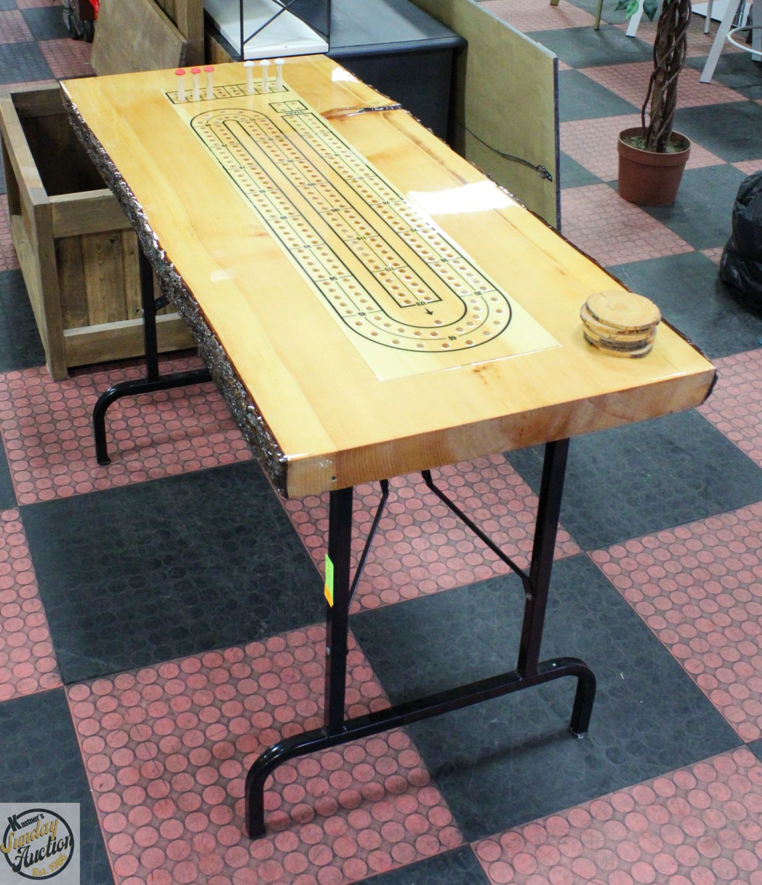 HANDMADE PEGS, COASTERS WITH METAL FOLDING LEGS *FINISHED WITH EPOXY* H-30" W-21" L-48" **ALL ITEMS MUST BE REMOVED BY 5PM SATURDAY, SEPTEMBER 27TH 2025. ALL REMAINING ITEMS WILL BE SUBJECT TO A $6.00 PER DAY STORAGE CHARGE. ANY ITEMS REMAINING AFTER MONDAY, OCTOBER 13TH 2025 WILL BE CONSIDERED FORFEITED. NO REFUNDS WILL BE ISSUED FOR FORFEITED ITEMS. TO SCHEDULE A PICK UP APPOINTMENT CLICK HERE