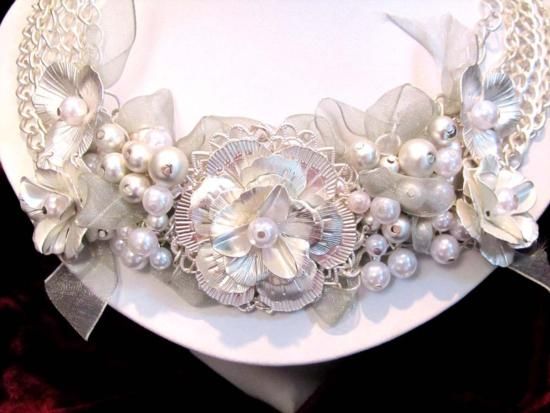HANDMADE VICTORIAN OOAK PEARL AND RIBBON BIB NECKLACE AND EARRINGS MWF1100