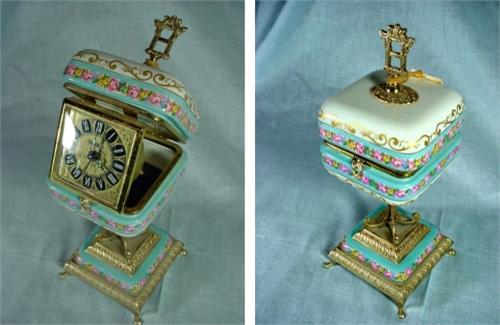 HANDPAINTED PORCELAIN BOX SEVERS CLOCK ON A FOOTED METAL BASE MARKED DECORD PARIS. CLOSED 9".
