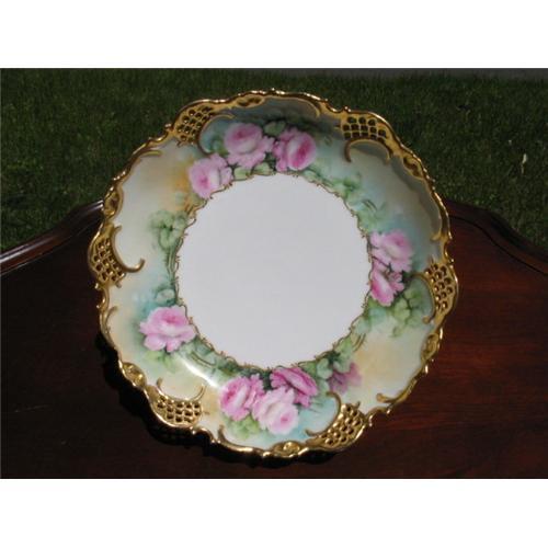 GORGEOUS HANDPAINTED ANTIQUE RETICULATED AUSTRIAN BOWL WITH CLUSTERS OF PINK ROSES AND LAVISH GILDING!</em></td>