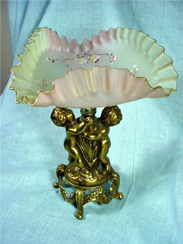 HANDPAINTED RUFFLED EDGE DISH SITTING ATOP A PAIR OF BRONZE FOOTED CHERUB BASE. 9"