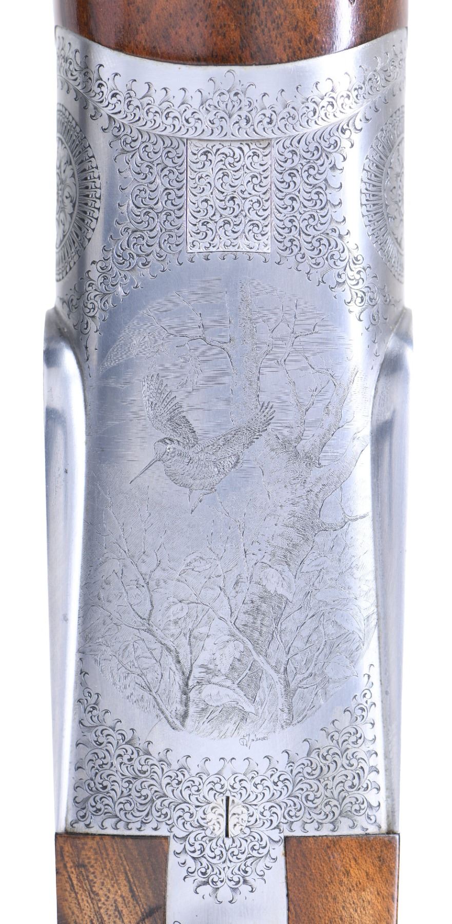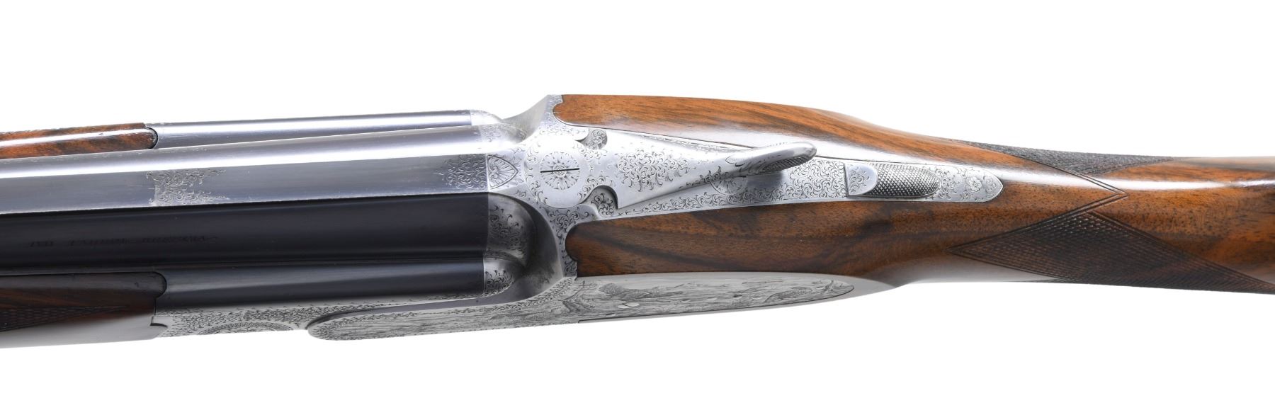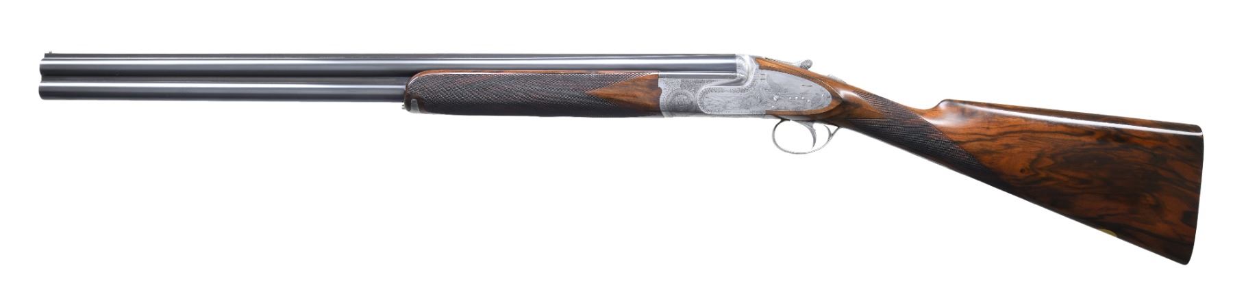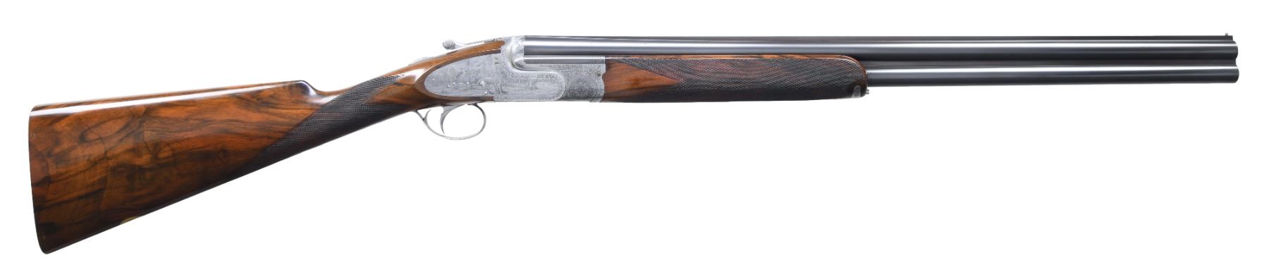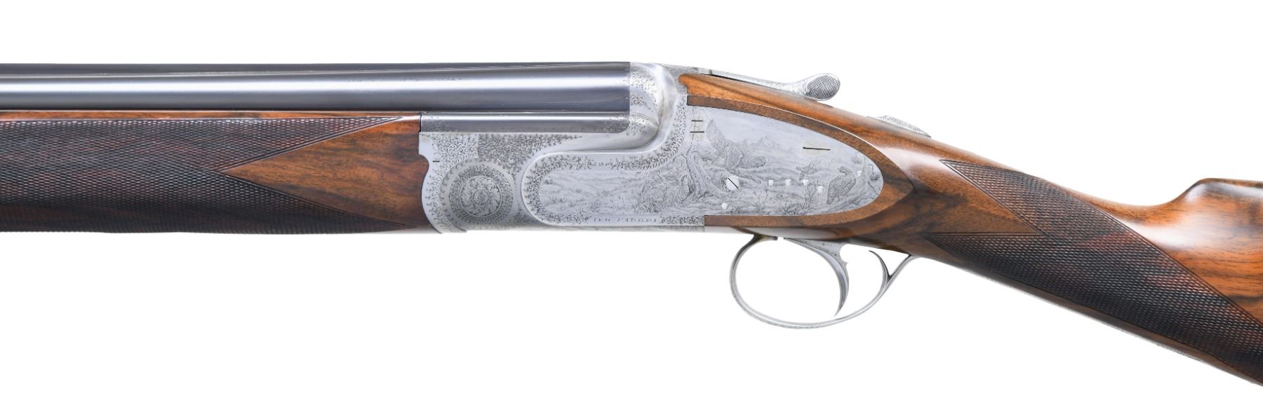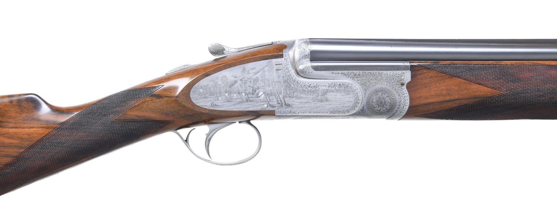 SCENE ENGRAVING BY CREATIVE ART WITH CASE. Cal. 12 Ga. 3". S# 3511. The 26" demi-block barrels with narrow unmatted concave rib are engraved "IVO FABBRI -BRESCIA-" on left side of top barrel and "VACUUM ARC REMELTING STEEL" on right. Barrel flats are stamped with 1990 Italian nitro proofs for 3" chambers. Coin finished low profile O/U sidelock action features non-automatic safety, engraved line tumbler end cocking indicators and single non-selective trigger. Action is engraved with near full coverage very nicely cut small scroll with Billino scene of woodcock flitting through alder branches on bottom. Maker's name is on each side. Lockplates are fully game scene engraved to outside edges with very finely rendered bird scenes. Left lock portrays a capercaillie displaying on an alpine tree branch while two hens and a subordinate male look on. Right lock has open woodland scene of driven pheasant. These scenes are dramatically detailed and shaded. The portrait of a pointer is on trigger guard bow framed by more small scroll. "Creative Art" is on trigger plate along with the signature "G. Steduto" (Giovanni) one of the early engravers working for this fine firm. Very attractive, well marbled and lightly figured European walnut straight grip buttstock measures 14-3/4" over fully checkered wood butt. Classic point pattern checkering is at grip and a vacant gold oval is on toeline. Matching one piece field type ejector forend has modified Anson type release. MEASUREMENTS: BBLS: Bore Diameter: O .726 U .726. Restriction: O .018 (Mod.) U .018 (Mod.). Wall thickness: O.032. U .031. STOCK: DAH: 2-7/16". DAC: 1-1/2"+. CAST: neutral. LOP: 14-3/4". WEIGHT: 7 lb. 0 oz. UNATTACHED ACCESSORIES: gun is housed in a tan leather case with stitched leather corners by Nizzoli. A greenish yellow Ivo Fabbri label is in lid. Bottom compartment is semi-French fitted for barrel and action. No accessories are present. CONDITION: exceptionally fine. Barrels retaining over 98% original blue with some sharp edge wear noted on rib. Coin finish of action and lockplates remain bright without any noted cleaning. Stocks retain nearly all of their original finish with a few very light marks noted on most of buttstock with a 6mm loss of finish and a small 10mm abrasion on right side near butt. Checkering remains clean and sharp. Bores are bright and shiny without any visible problems. Action is tight; mechanically crisp. Case leather shows some water spots and areas of darkening with a good scattering of light marks and compressions overall. Interior cloth is very good to fine with some puckers in lid and some soiling from contact with gun in bottom compartment. A lovely example of one of the finest shotguns ever made. A scarce gun. Fabbri probably makes two target type guns to one field gun. (25-936/MGM). MODERN. $25,000-40,000.