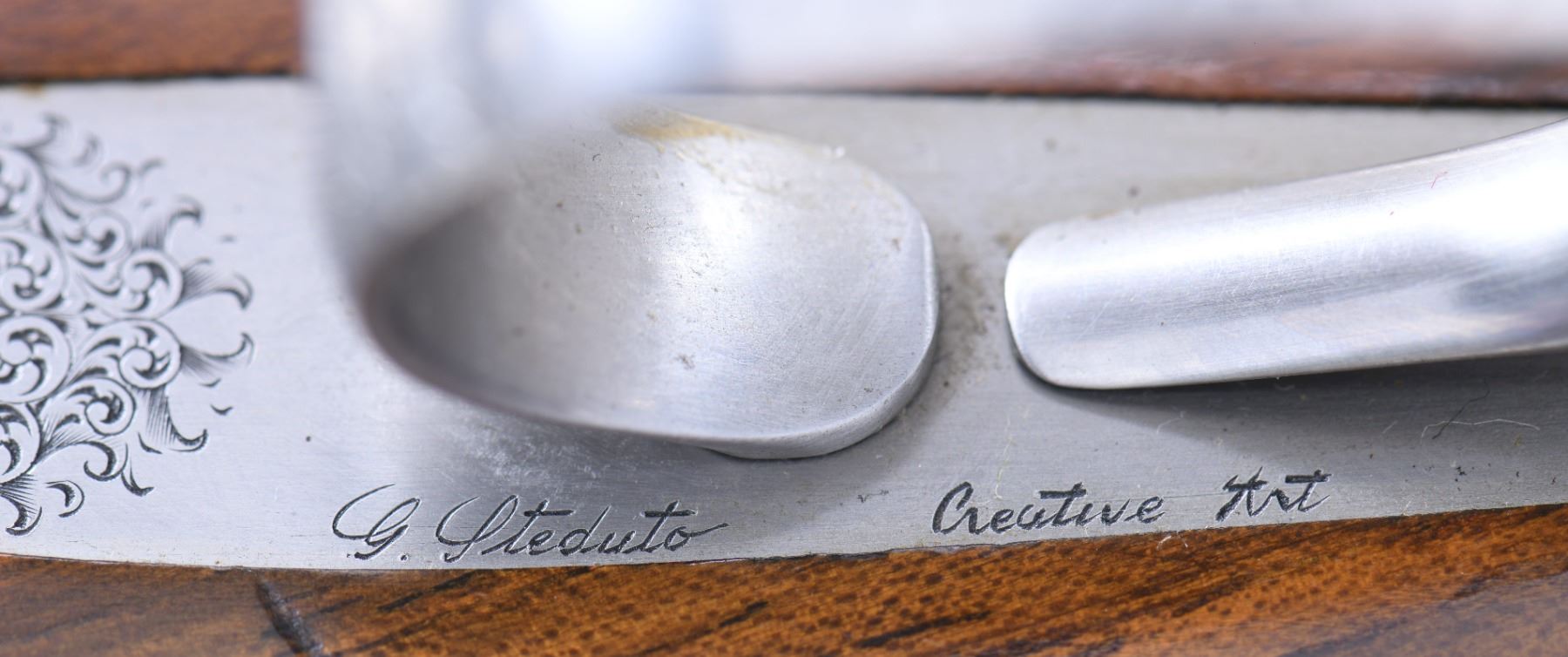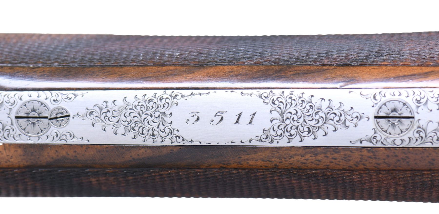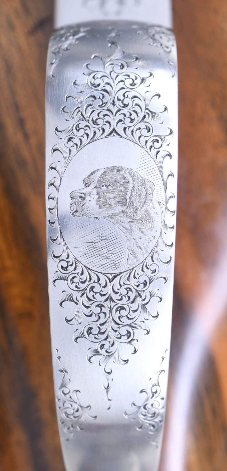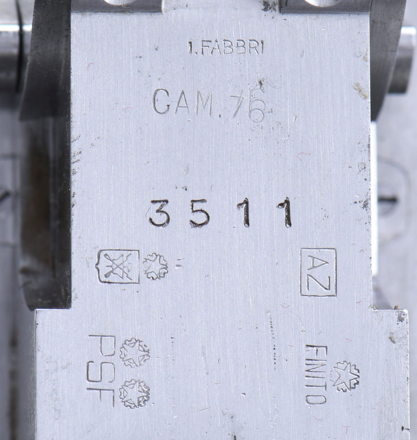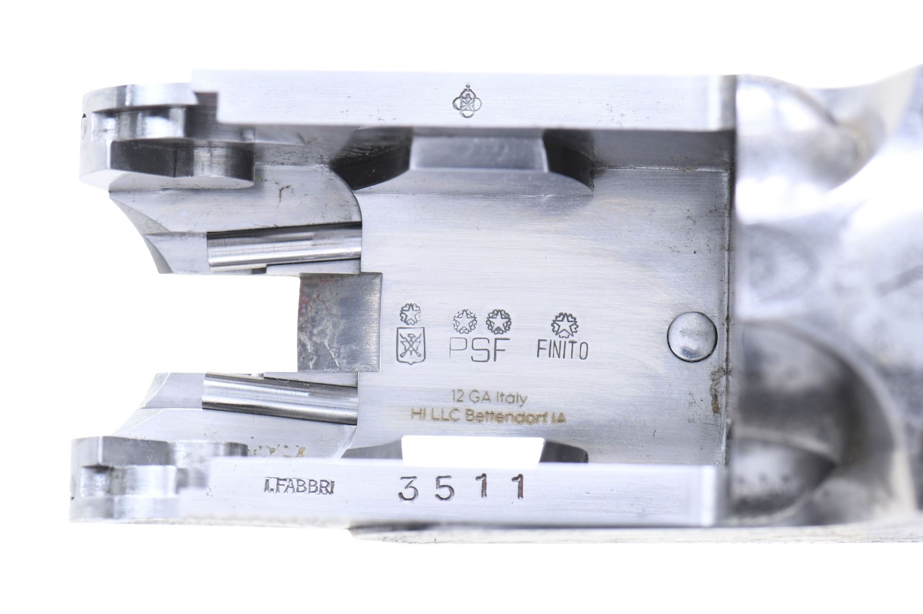 SCENE ENGRAVING BY CREATIVE ART WITH CASE. Cal. 12 Ga. 3". S# 3511. The 26" demi-block barrels with narrow unmatted concave rib are engraved "IVO FABBRI -BRESCIA-" on left side of top barrel and "VACUUM ARC REMELTING STEEL" on right. Barrel flats are stamped with 1990 Italian nitro proofs for 3" chambers. Coin finished low profile O/U sidelock action features non-automatic safety, engraved line tumbler end cocking indicators and single non-selective trigger. Action is engraved with near full coverage very nicely cut small scroll with Billino scene of woodcock flitting through alder branches on bottom. Maker's name is on each side. Lockplates are fully game scene engraved to outside edges with very finely rendered bird scenes. Left lock portrays a capercaillie displaying on an alpine tree branch while two hens and a subordinate male look on. Right lock has open woodland scene of driven pheasant. These scenes are dramatically detailed and shaded. The portrait of a pointer is on trigger guard bow framed by more small scroll. "Creative Art" is on trigger plate along with the signature "G. Steduto" (Giovanni) one of the early engravers working for this fine firm. Very attractive, well marbled and lightly figured European walnut straight grip buttstock measures 14-3/4" over fully checkered wood butt. Classic point pattern checkering is at grip and a vacant gold oval is on toeline. Matching one piece field type ejector forend has modified Anson type release. MEASUREMENTS: BBLS: Bore Diameter: O .726 U .726. Restriction: O .018 (Mod.) U .018 (Mod.). Wall thickness: O.032. U .031. STOCK: DAH: 2-7/16". DAC: 1-1/2"+. CAST: neutral. LOP: 14-3/4". WEIGHT: 7 lb. 0 oz. UNATTACHED ACCESSORIES: gun is housed in a tan leather case with stitched leather corners by Nizzoli. A greenish yellow Ivo Fabbri label is in lid. Bottom compartment is semi-French fitted for barrel and action. No accessories are present. CONDITION: exceptionally fine. Barrels retaining over 98% original blue with some sharp edge wear noted on rib. Coin finish of action and lockplates remain bright without any noted cleaning. Stocks retain nearly all of their original finish with a few very light marks noted on most of buttstock with a 6mm loss of finish and a small 10mm abrasion on right side near butt. Checkering remains clean and sharp. Bores are bright and shiny without any visible problems. Action is tight; mechanically crisp. Case leather shows some water spots and areas of darkening with a good scattering of light marks and compressions overall. Interior cloth is very good to fine with some puckers in lid and some soiling from contact with gun in bottom compartment. A lovely example of one of the finest shotguns ever made. A scarce gun. Fabbri probably makes two target type guns to one field gun. (25-936/MGM). MODERN. $25,000-40,000.
