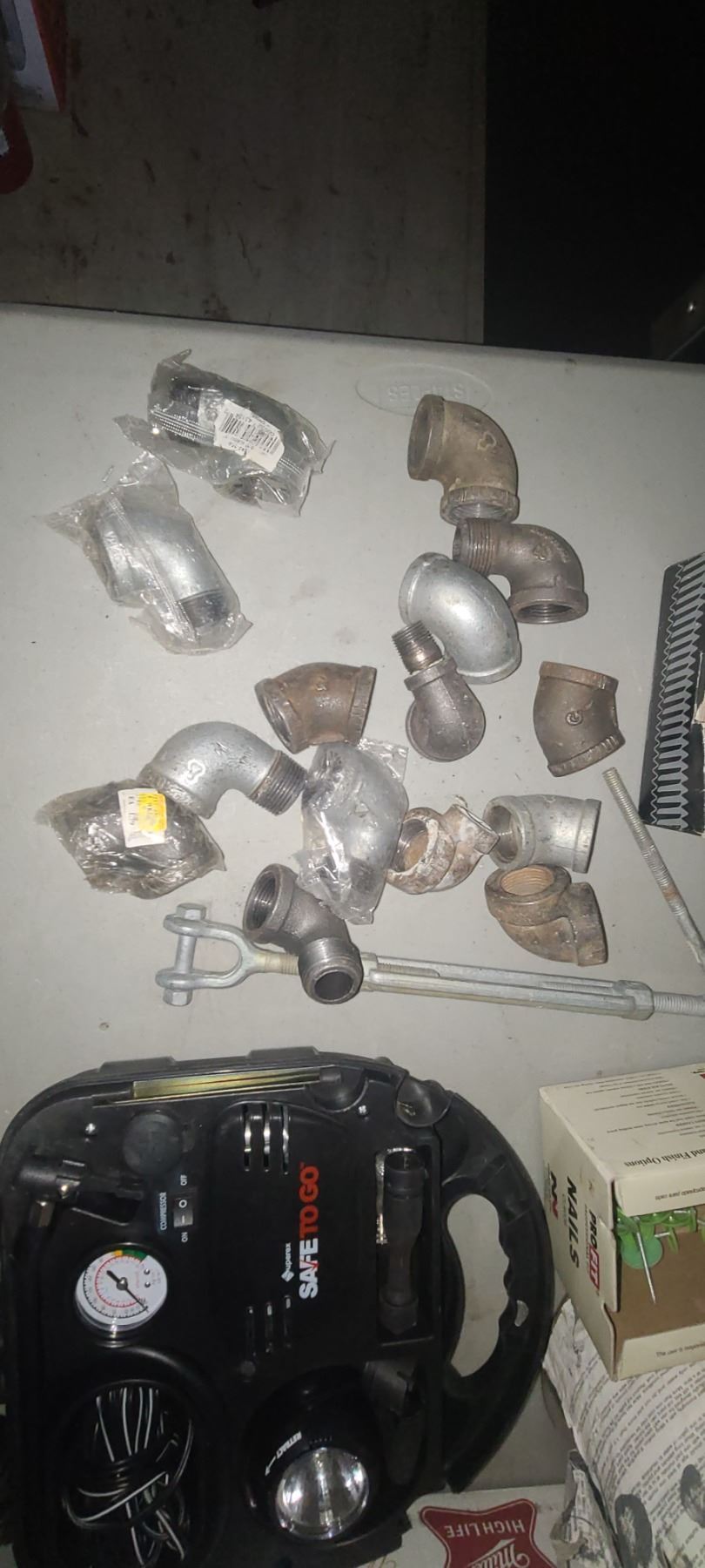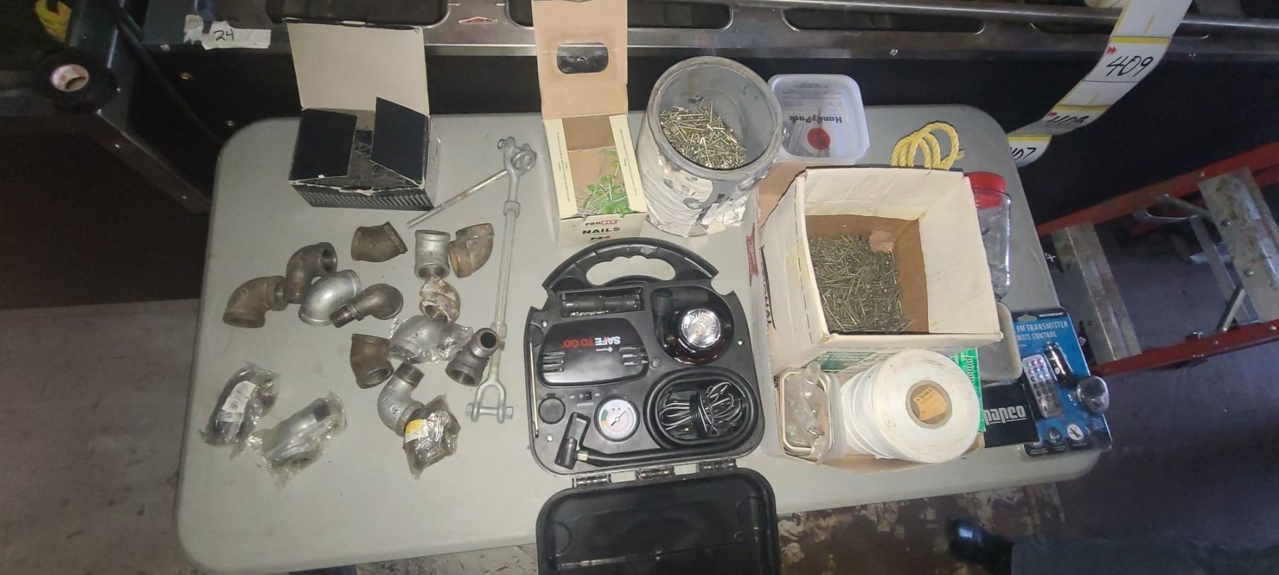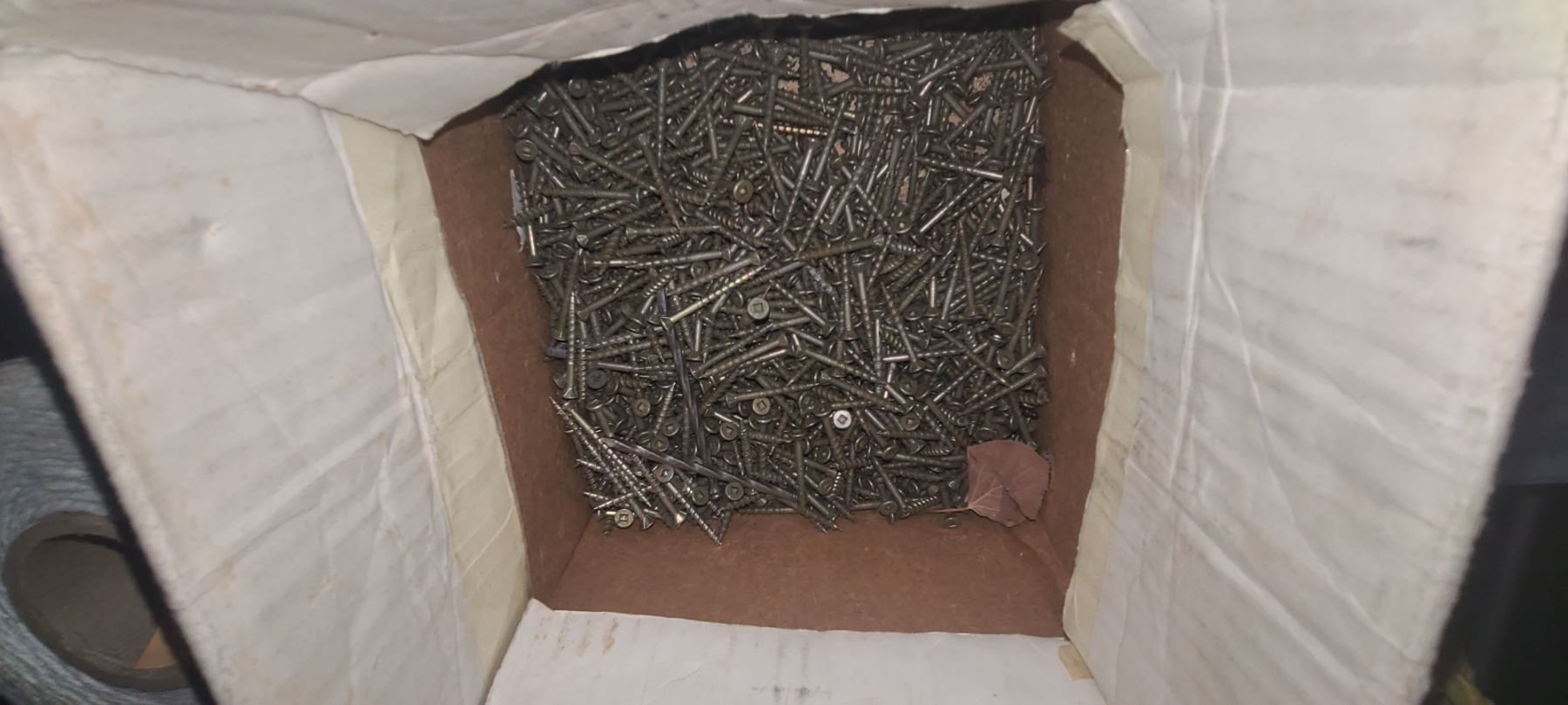 HANDY MAN HARDWARE LOT: DECK SCREWS 1 2/2" AND 2", 24GA GALVANIZED STRAPPING, 1 1/2" WOOD SCREWS, PEG BOARD HOOKS