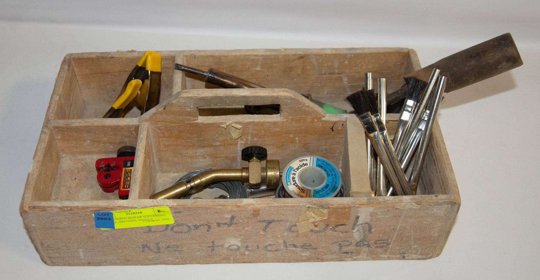 HANDYMAN BOX OF SOLDERING IRONS, BRUSHES, SPOOLS
