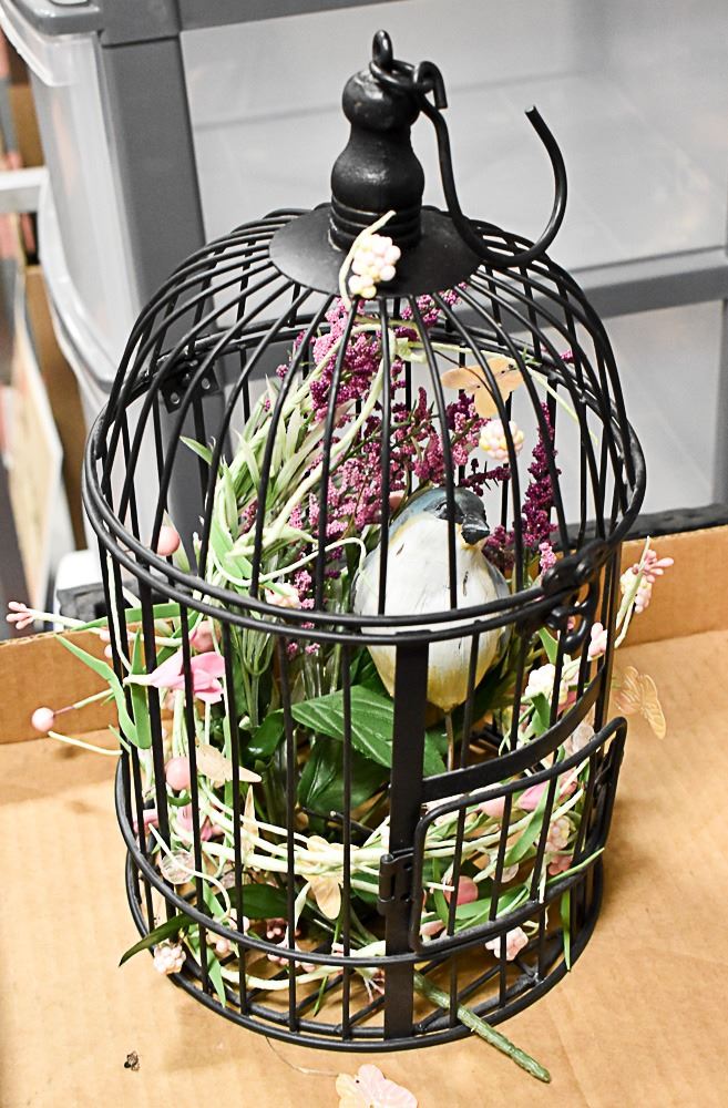 HANGING BIRDCAGE WITH BIRD, FLORAL ACCESSORIES