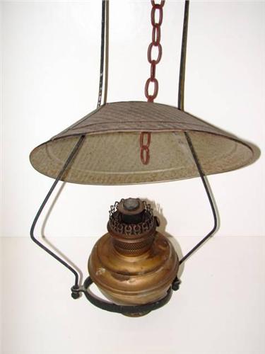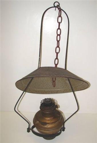 HANGING BRASS STORE LAMP. Has brass font with tin shade and glass chimney. Brass does show some tarnishing. Lamp is marked "RAYO" at top. 31" H