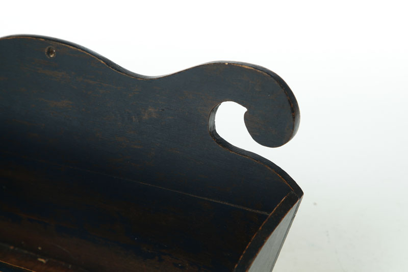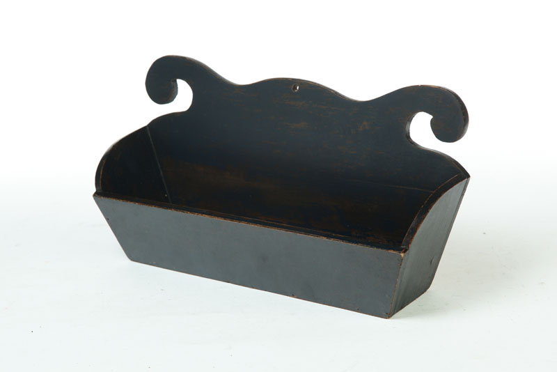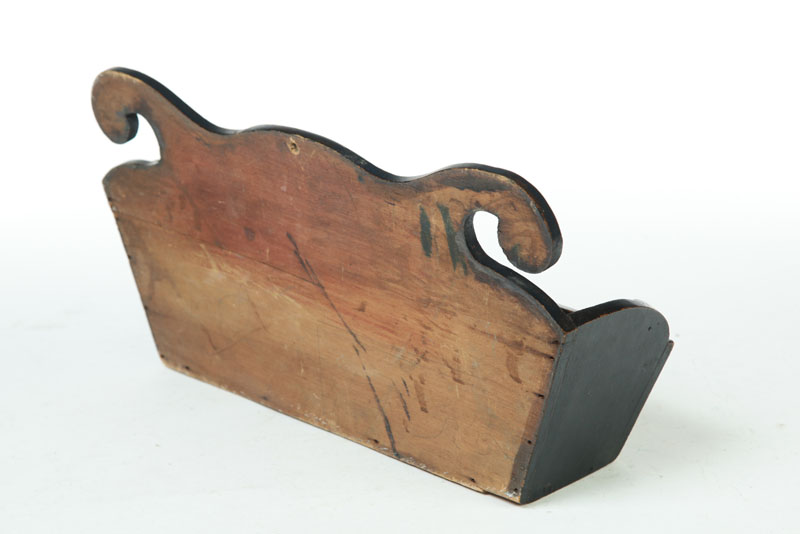 Late 19th-early 20th century, softwood. Folksy box with scrolled top, canted sides, and blue paint. 8 1/2"h. 16 1/2"w.