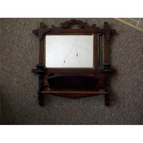 This is a Victorian comb case, mirror, towel bar with candle sconces on either side of the mirror. At the top of the mirror are leaf carvings in each corner. The wood appears to be walnut. There is a painted floral design on the front of the comb case. A part of the top decoration is missing. The mirror is original and there are some minor wear spots in the silver.