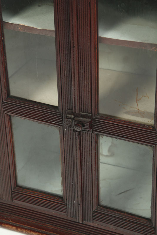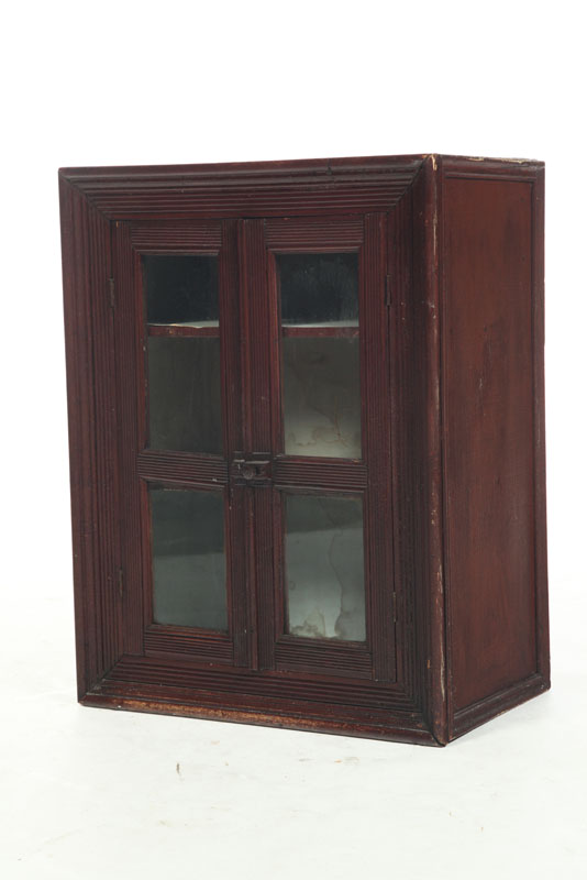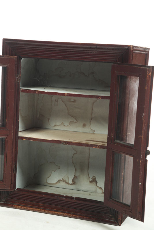 American, late 19th early-20th century, pine. Applied picture frame moldings, double doors with old glass. Old brown paint. 25"h. 20"w. 11 1/2"d.