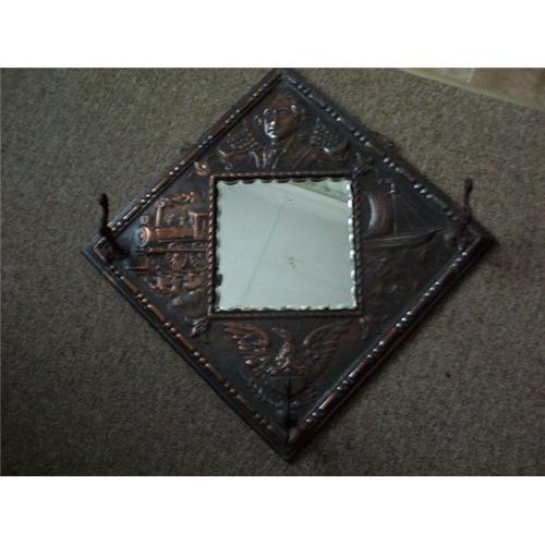 A vintage decorative copper plated tin hat rack with mirror. The tin is wrapped over a board. In relief on the metal: top is George Washington, bottom is an eagle, left is a railroad steam engine, and right is a sailing ship. There are three (3) hat hooks. The mirron is plate thickness with a crimped edge. There are some spots in the mirror silver from age. A great vintage piece.