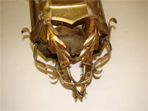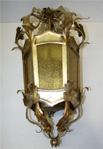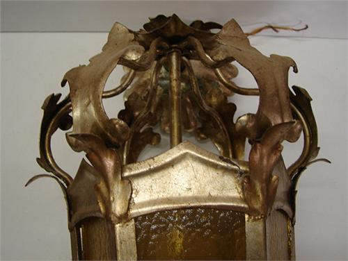 HANGING METAL LANTERN. Gilt painted. Has amber glass panels. Shows some loss to gilt. 21” H