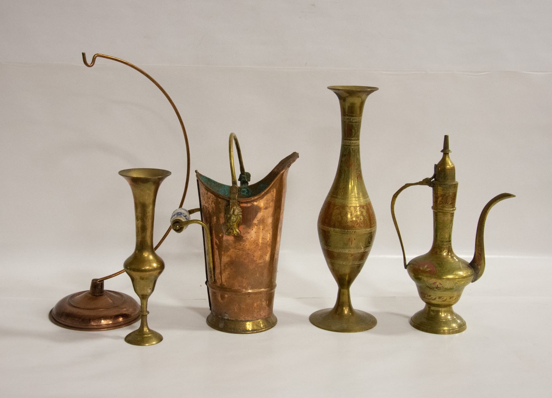 HANGING PITCHER, DECANTER, 2 SMALL VASES