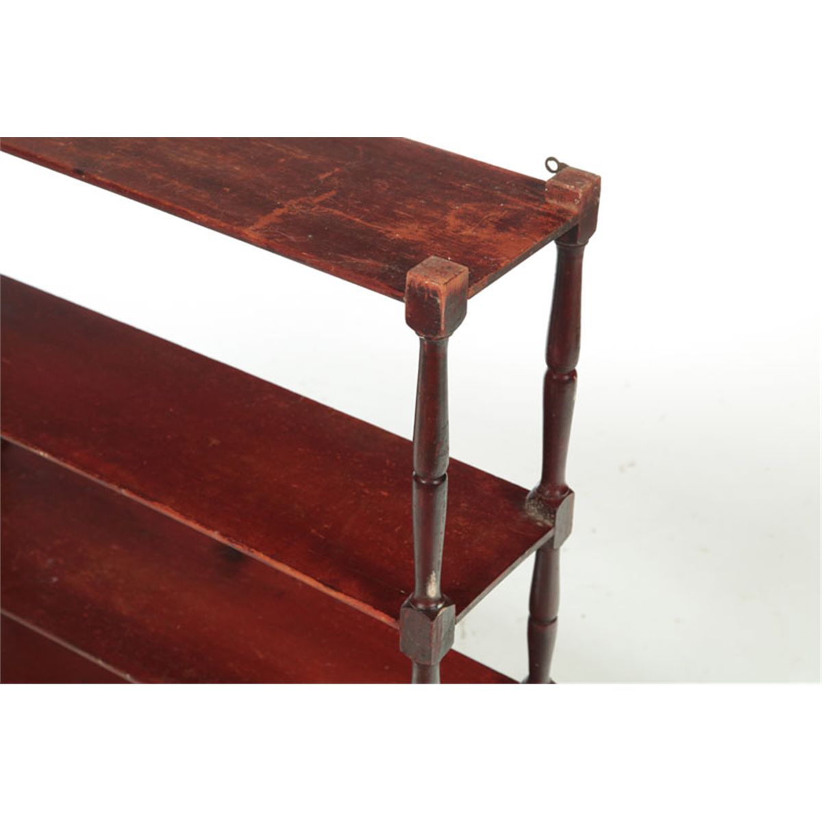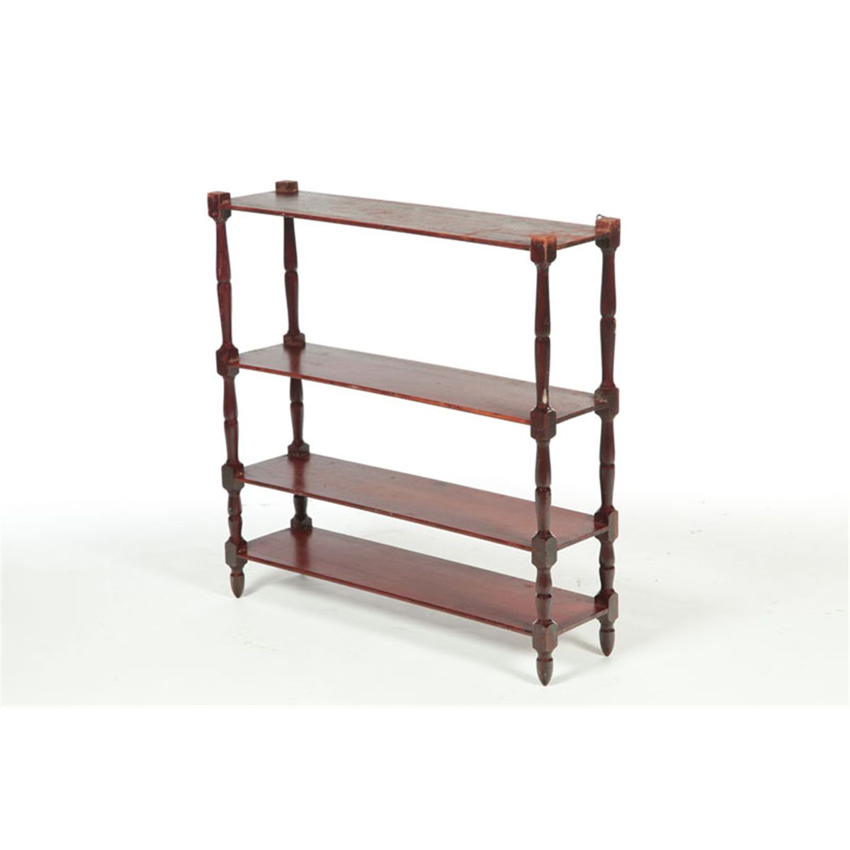 American, 19th century, appear to be maple and pine. Folksy turned stiles and four shelves of graduated height. Original reddish-brown paint. 33"h. 32"w. 9"d.