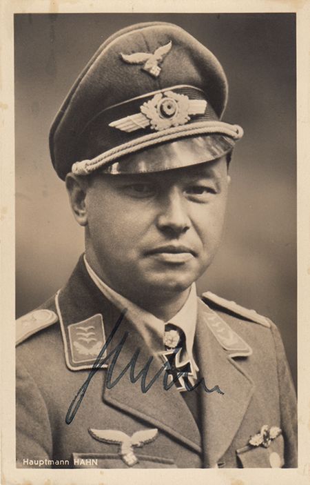 (1914 - 1982) German Luftwaffe ace of World War II with 108 victories in some 560 missions, awarded the Knights Cross with Oak Leaves before being captured by the Russians. S.P. 3 1/2" x 5 1/2" b/w, a chest, up portrait by Hoffmann, boldly signed at bottom. A few trivial spots near top margin, else very good.