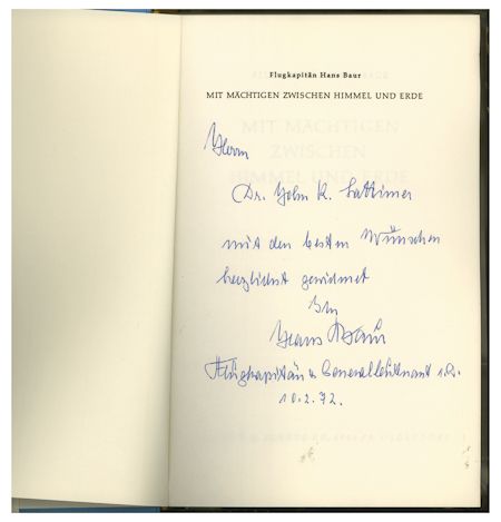 (1887-1993) German Luftwaffe pilot, private pilot to Adolf Hitler. His volume Mit Machtigen zwischen Himmel unde Erde("With Powerful Beetween Heaven and Earth") (K. W. Shutz, 1971), boldly inscribed on half title page in German to Dr. John Lattimer, adding date "1p.2.72". Near fine condition.