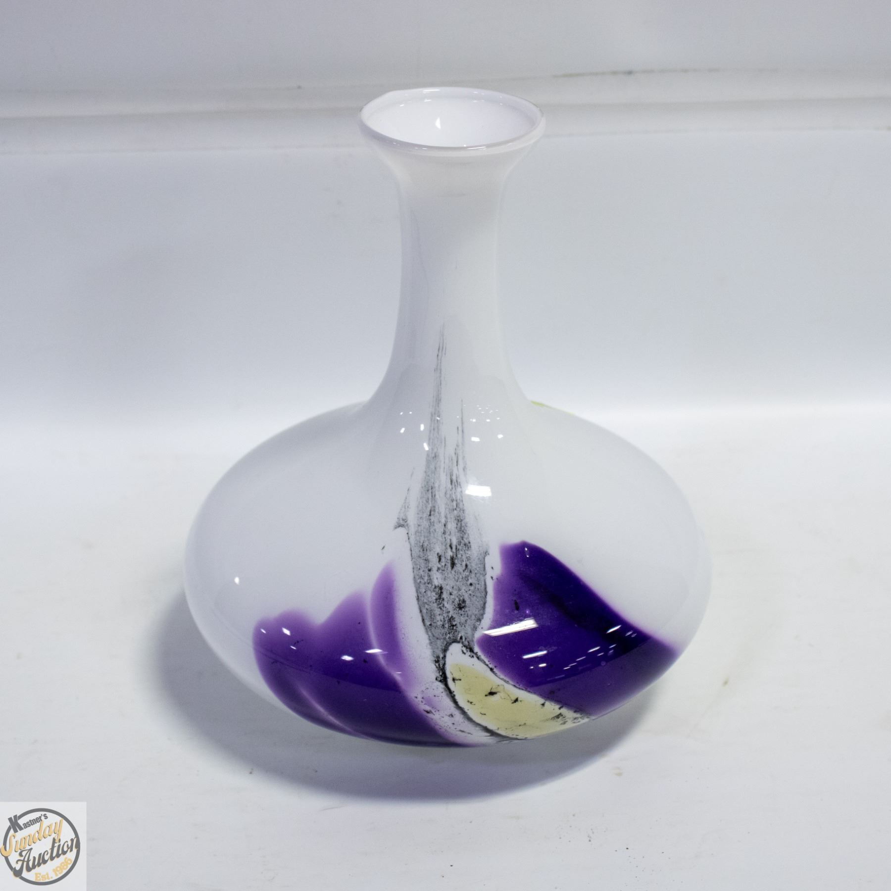 HANS JURGEN RICHARTZ WHITE AND PURPLE GLASS VASE.